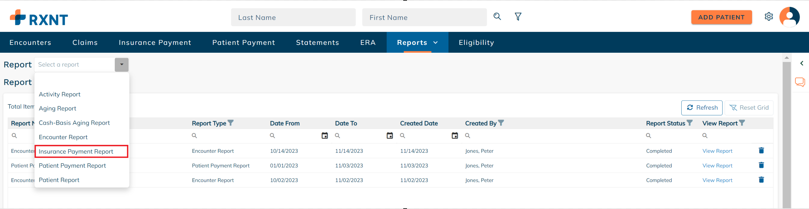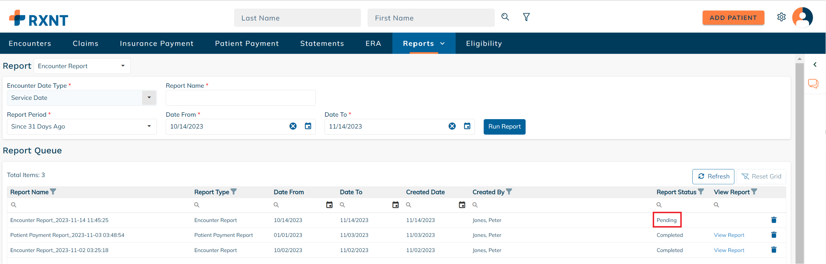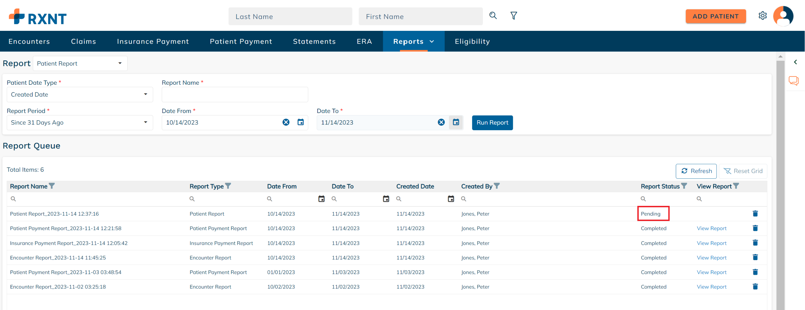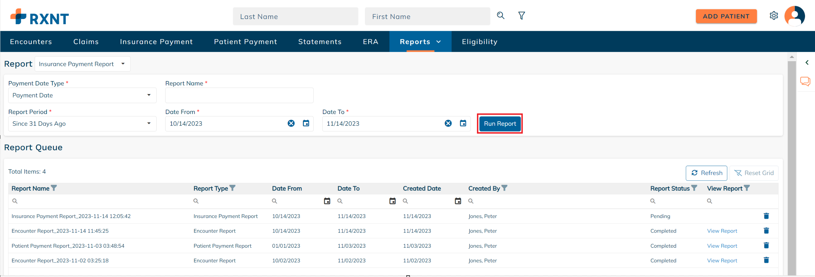 The Insurance Payment Report will be added to the queue in the Pending state.