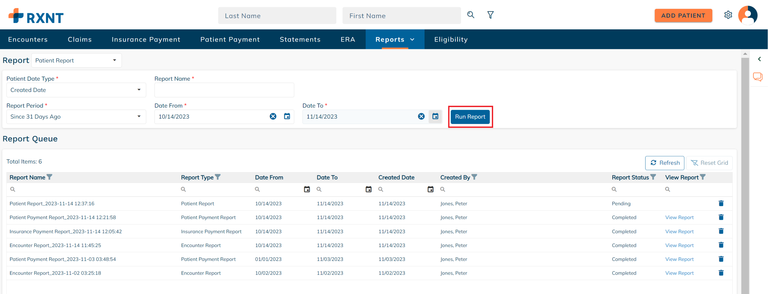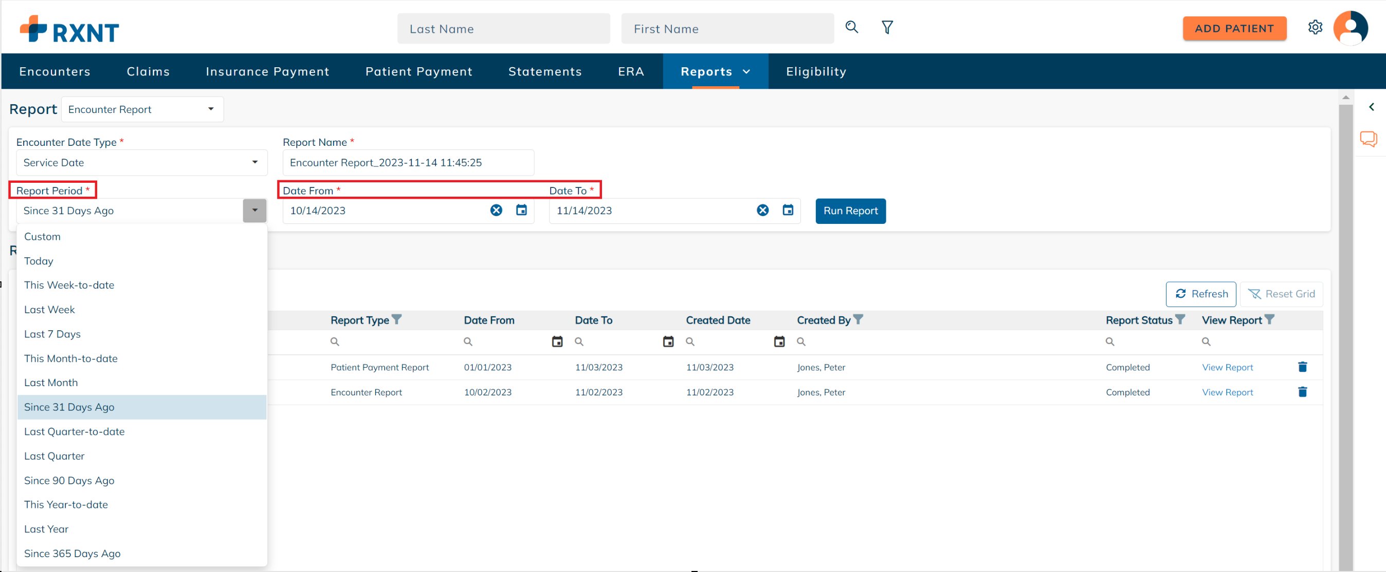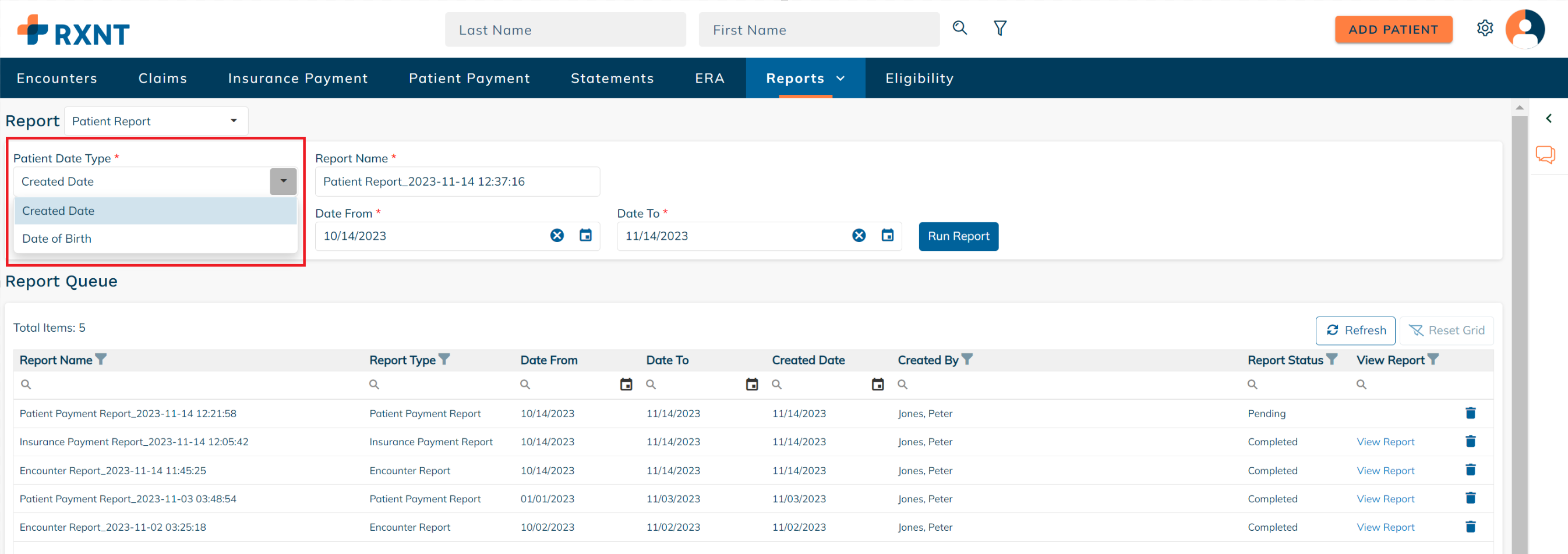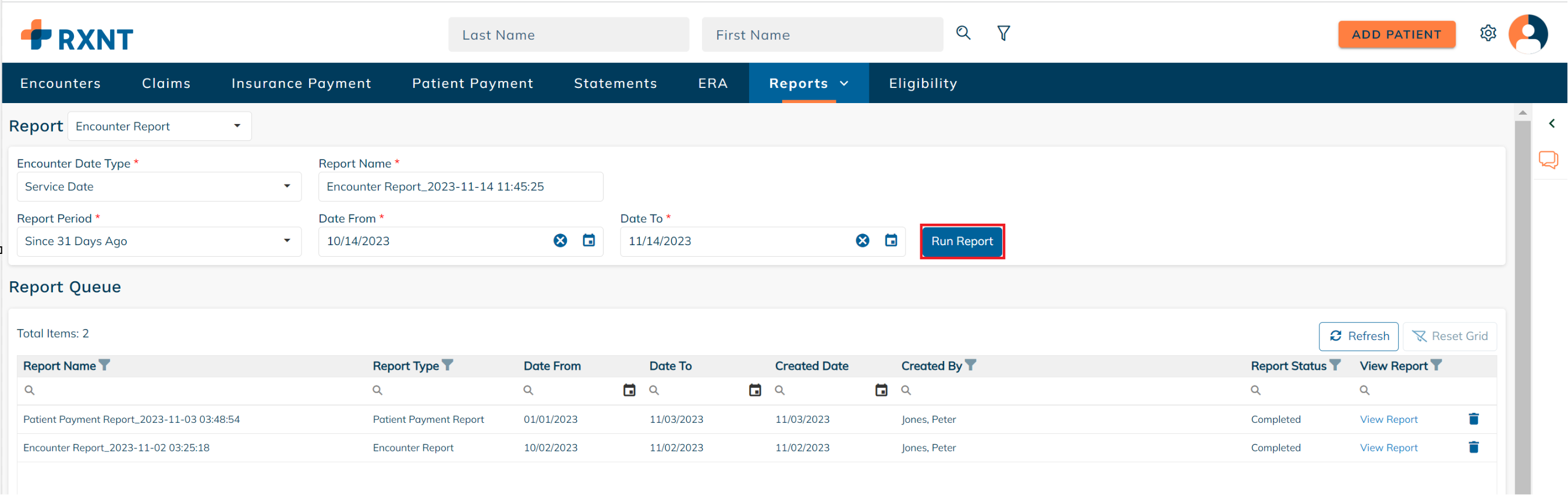 Click Run Report to generate the Patient Report. This report will filter the encounters based on the date type and range selected.