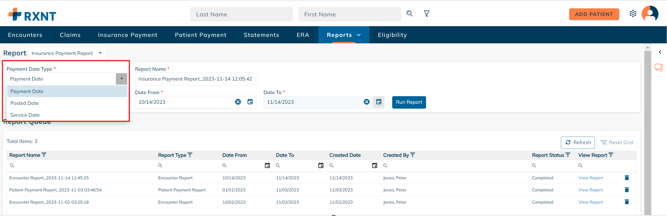 Click Run Report to generate the Insurance Payment Report. This report will filter the encounters based on the date type and range selected.