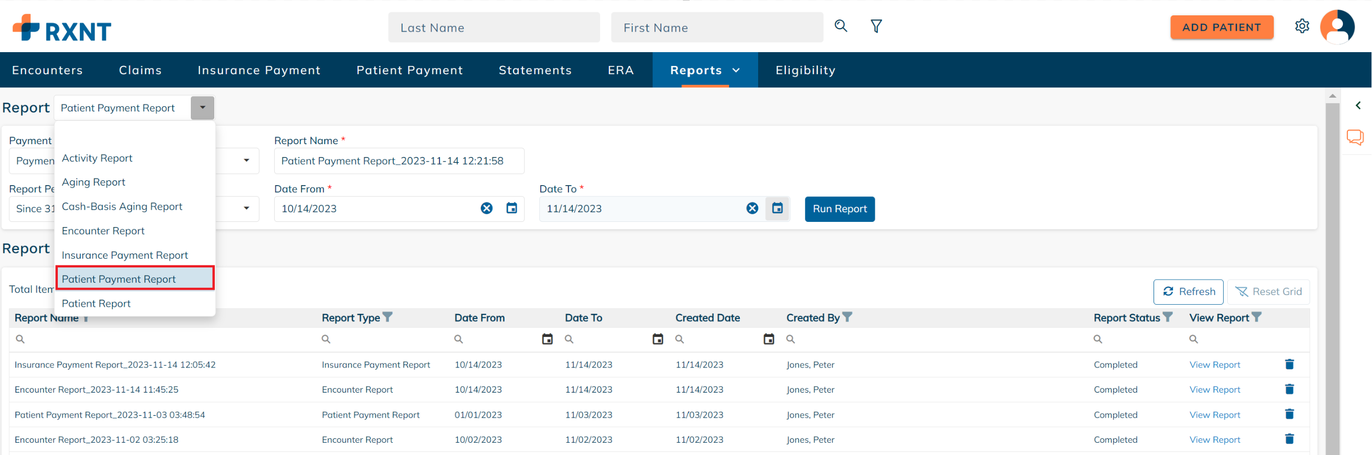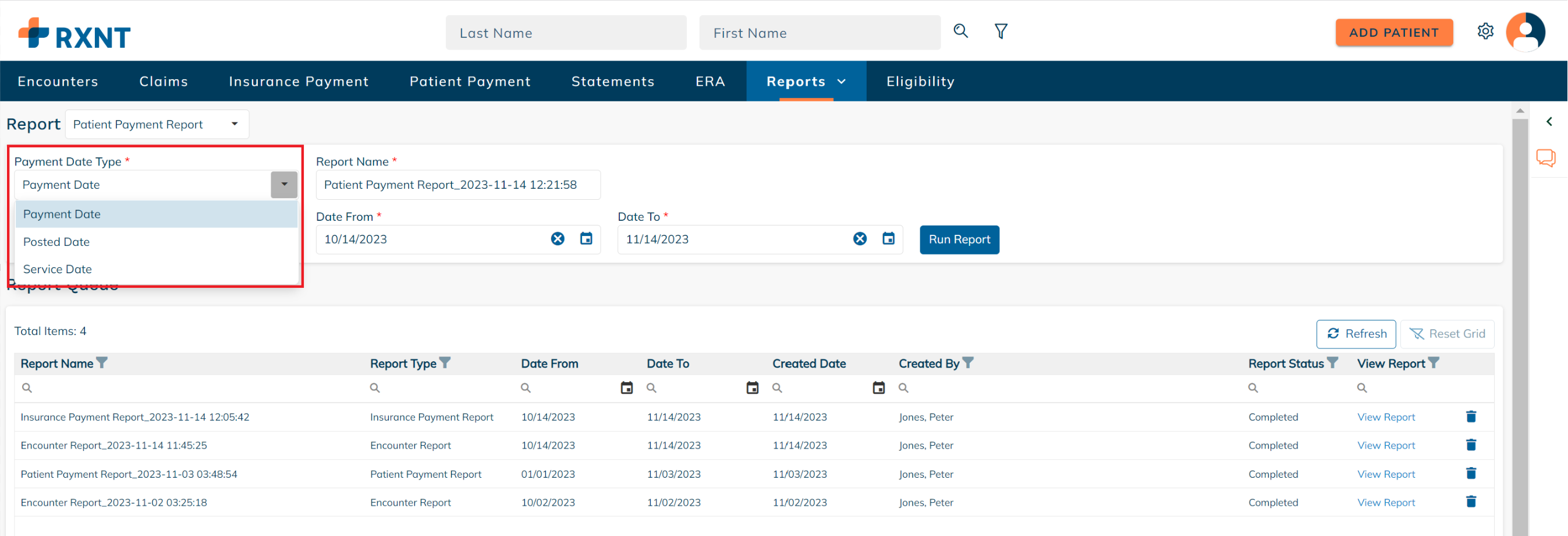 Click Run Report to generate the Patient Payment Report. This report will filter the encounters based on the date type and range selected.