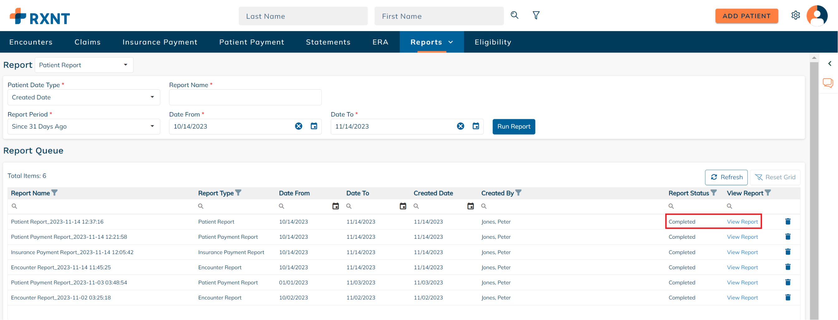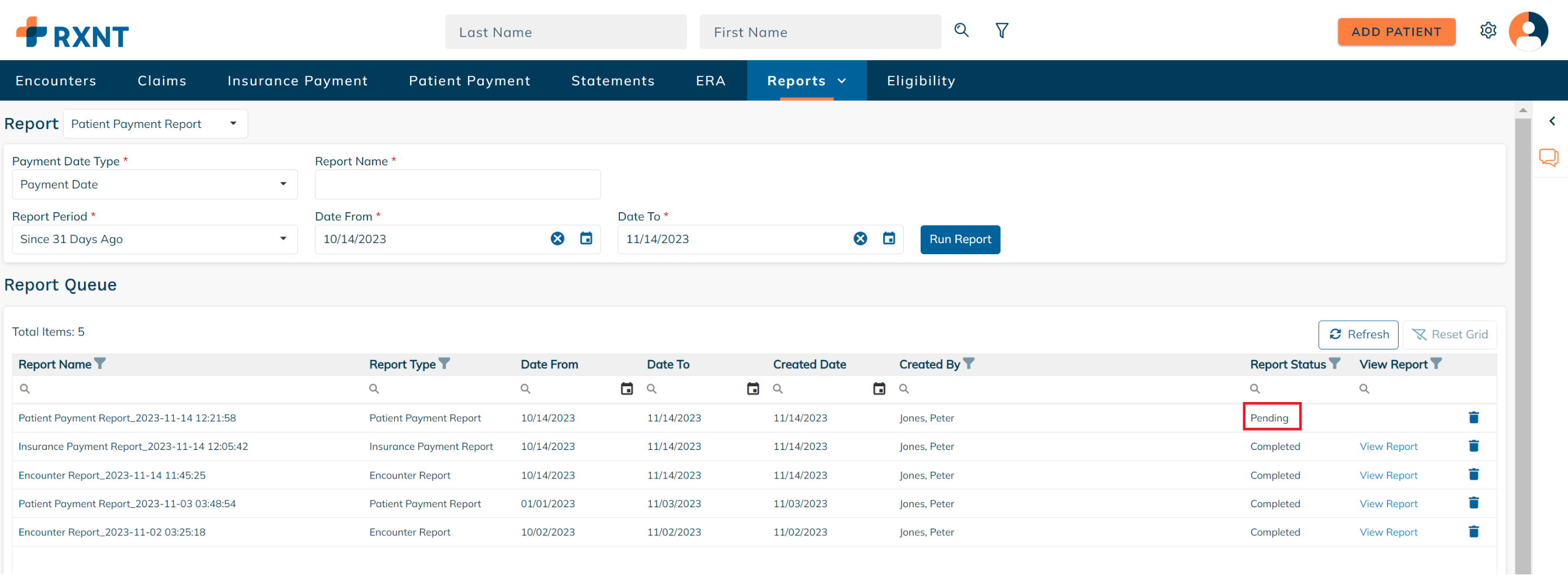 The Patient Payment Report will be added to the queue in the In Progress state.