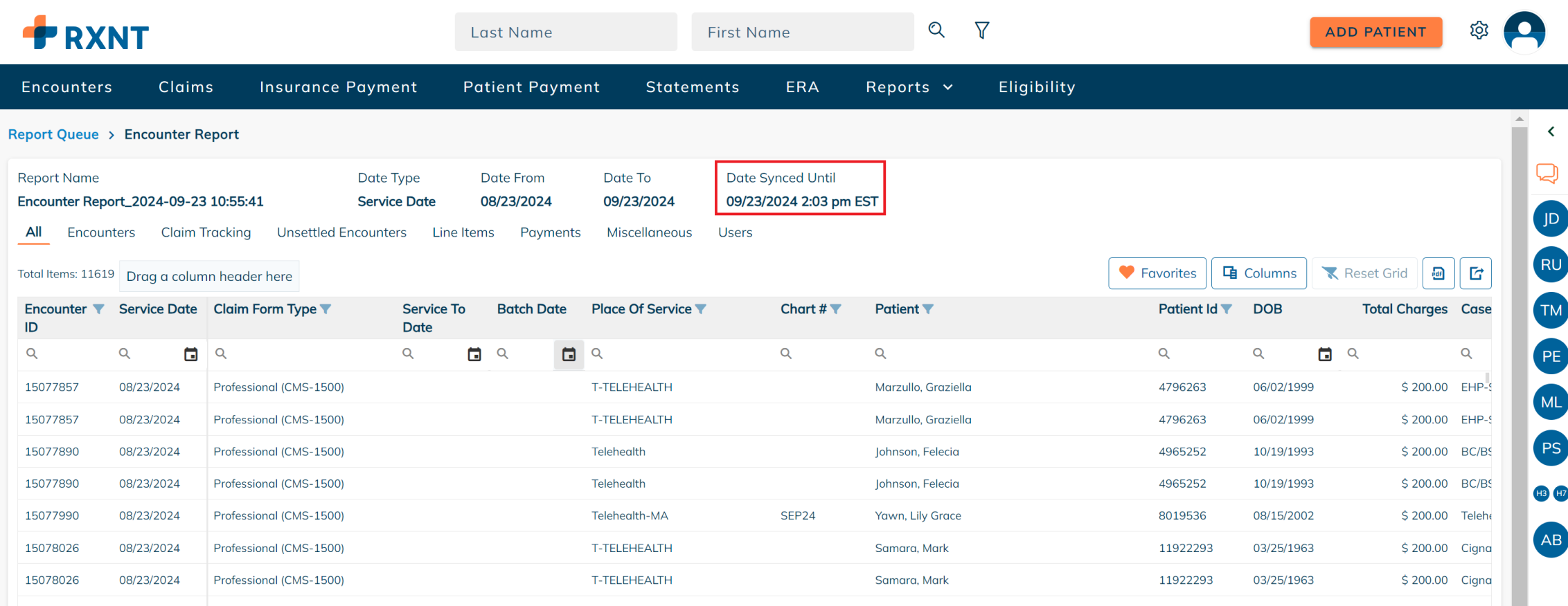 The Encounter Report fetches data from the data warehouse. This does not affect your data or impact your totals, but the frequency of data updates will change to every 2 hours. The date and time of the latest data update is indicated under the **Data Synced Until** field.