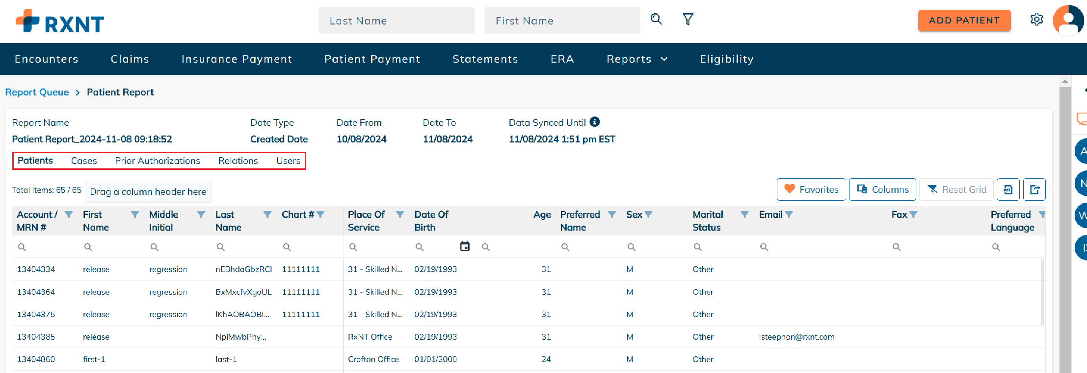 - Patients - Displays patient demographic details associated with the filtered patients.