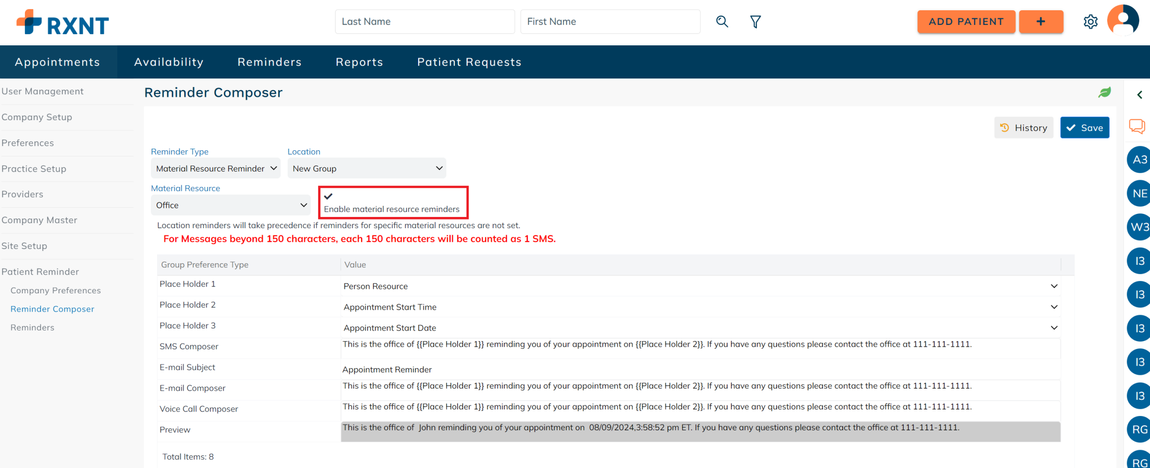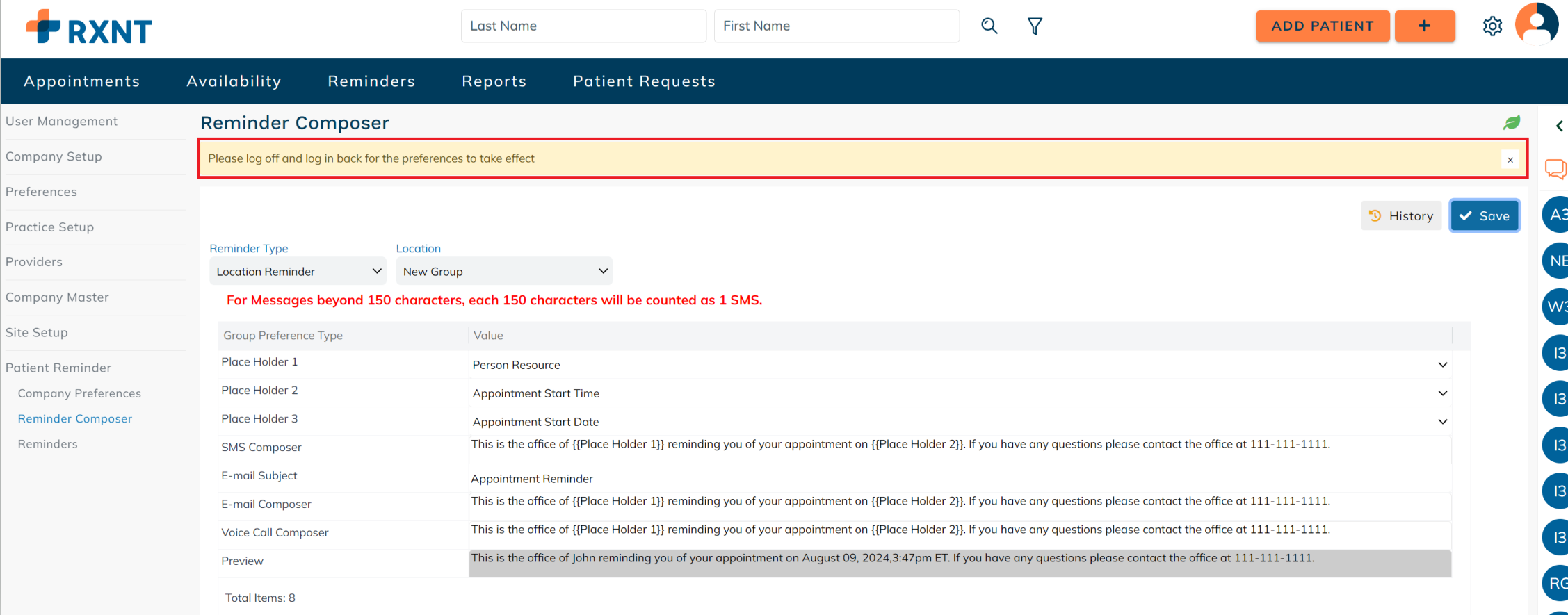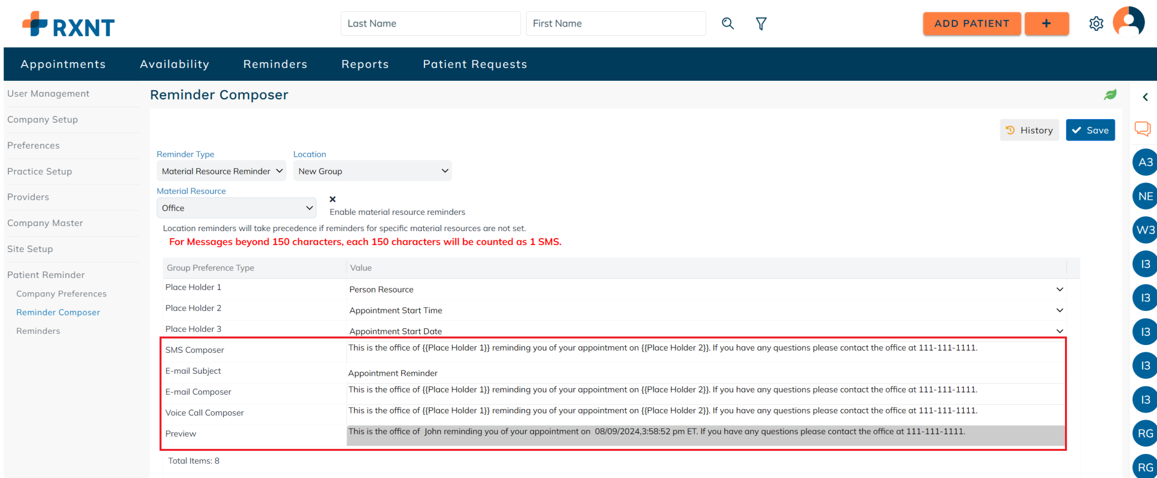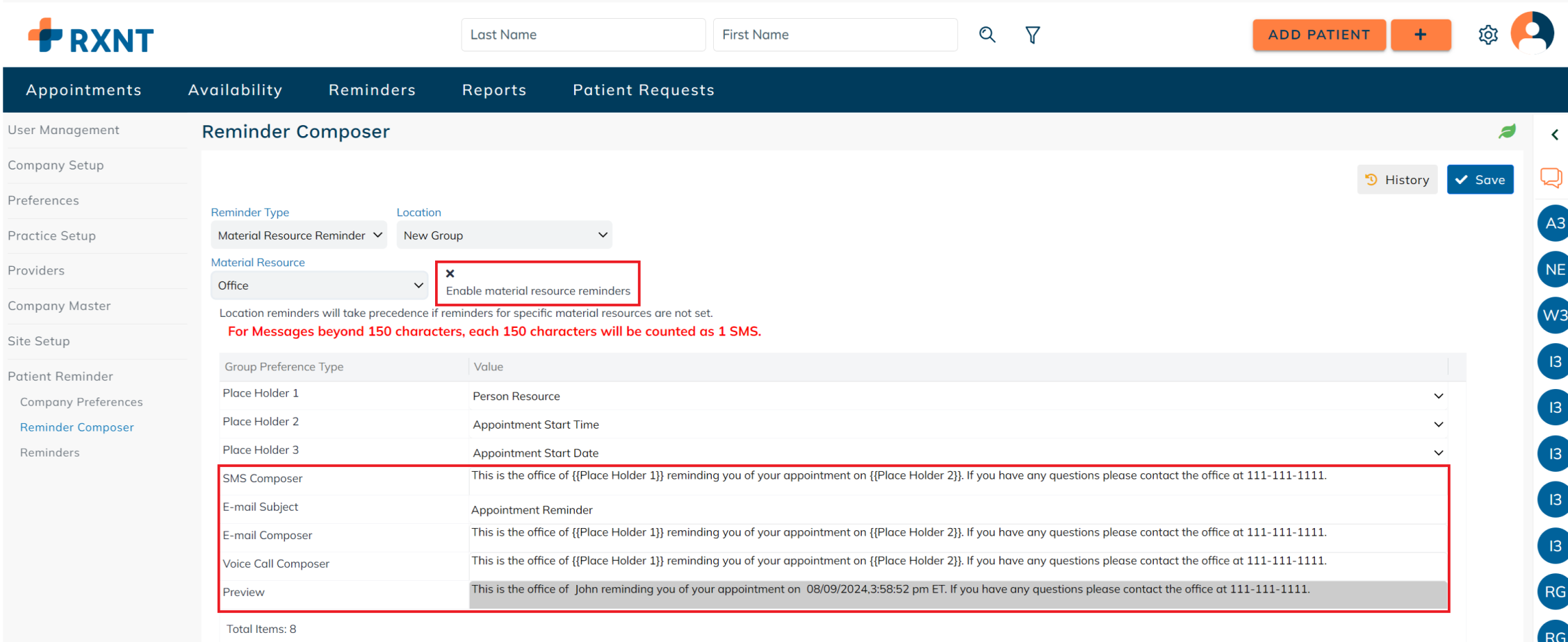 Setup company preferences for sending appointment reminders. These preferences are applied on a company level and may differ for each patient based on their authorized communication methods and communication restrictions. For example: If the company has SMS as a mode of communication for sending out patient reminders, but the patient's authorized communication method does not include SMS, then the patient reminder will not be sent to the patient.