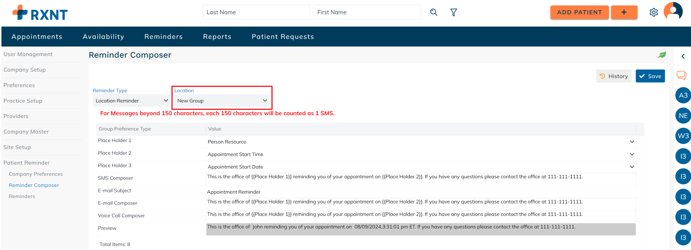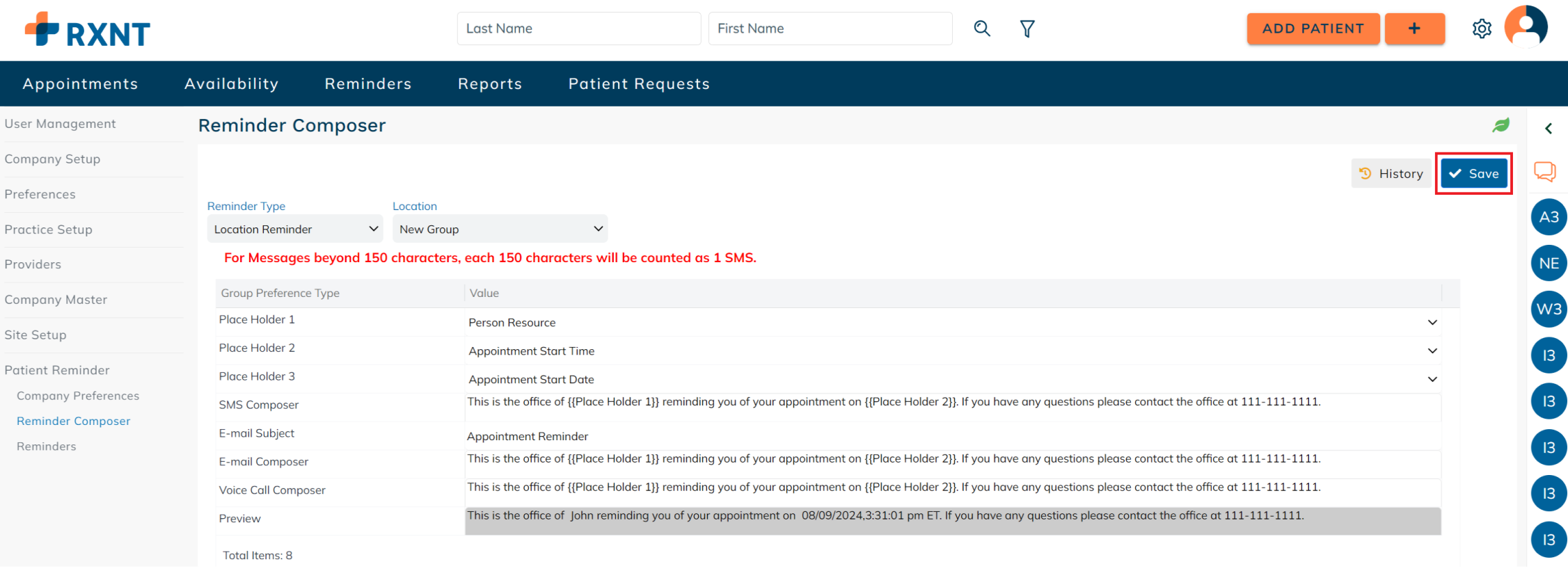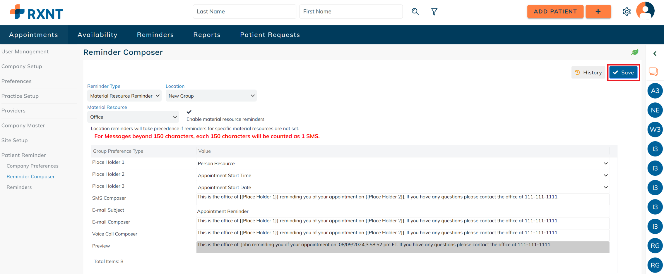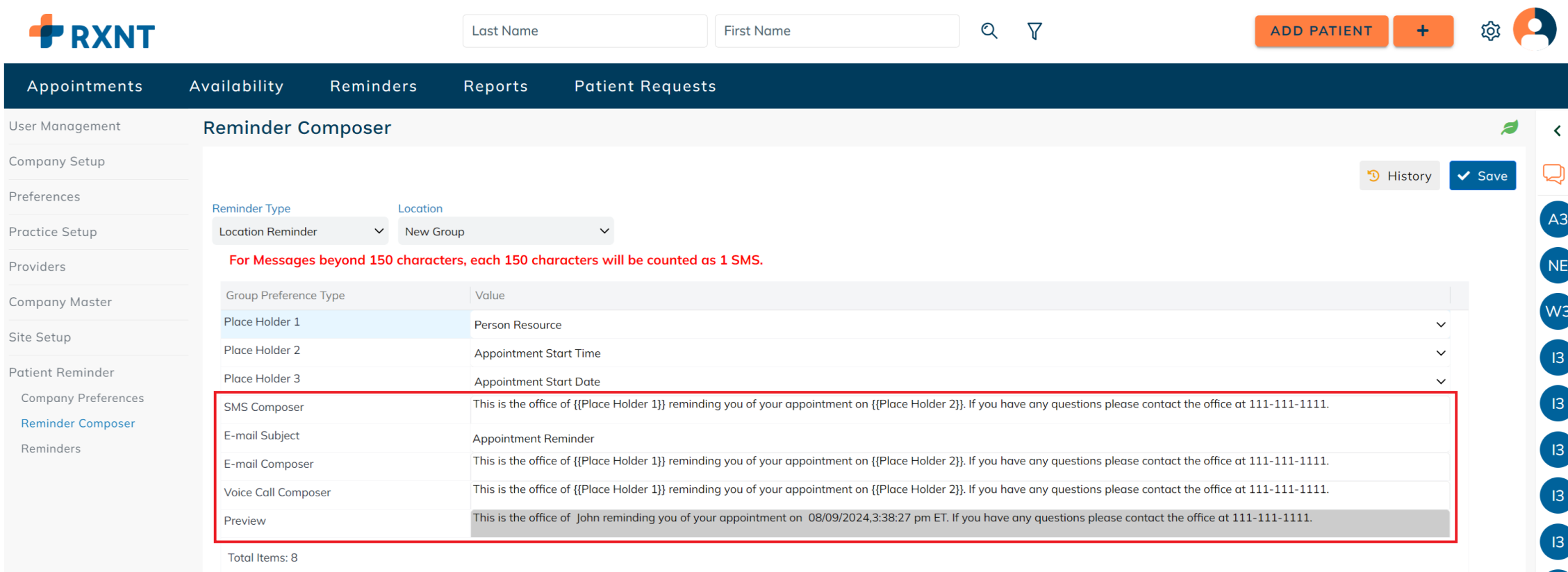 Setup company preferences for sending appointment reminders. These preferences are applied on a company level and may differ for each patient based on their authorized communication methods and communication restrictions. For example: If the company has SMS as a mode of communication for sending out patient reminders, but the patient's authorized communication method does not include SMS, then the patient reminder will not be sent to the patient.
