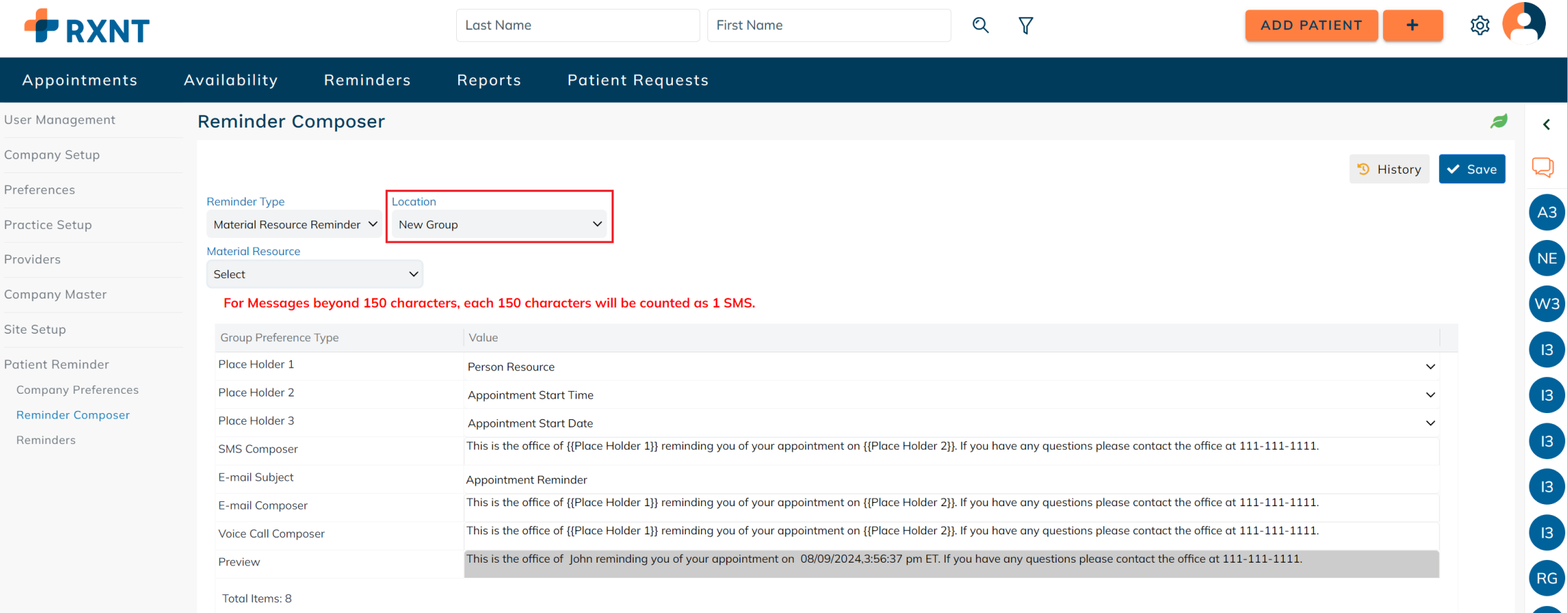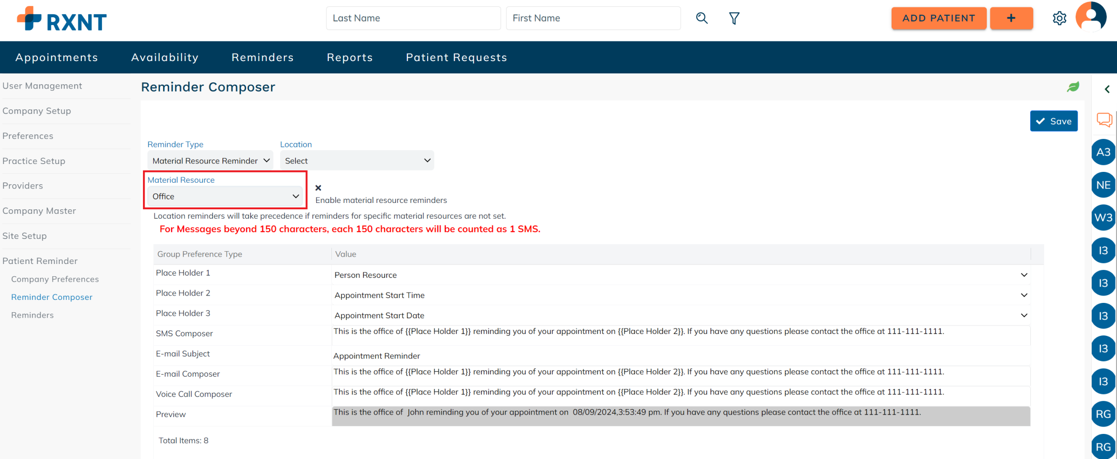 Customize patient reminders based on the material resource or location of the patient's appointment. This feature gives much flexibility in customizing messages to different groups of people.