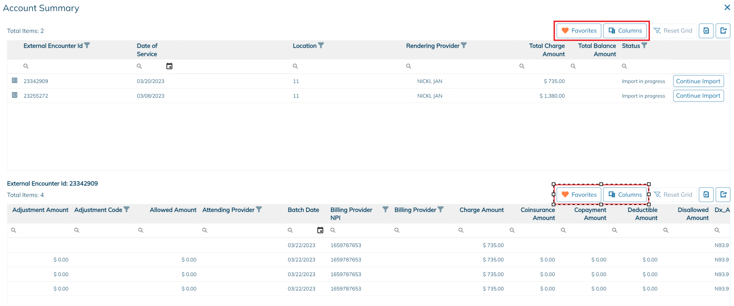 The Account Summary screen provides a clear bifurcation between the charges, line items, and payments associated with charges. This data is included as part of your import files.