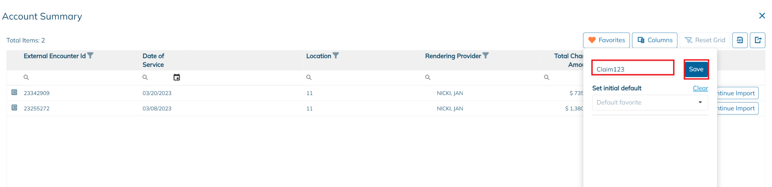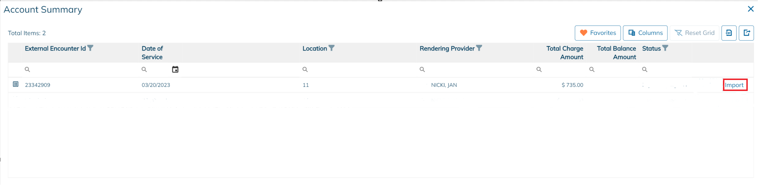 After deciding on a particular row, click Import on the right-hand side to start the import process for any associated charges and payments.