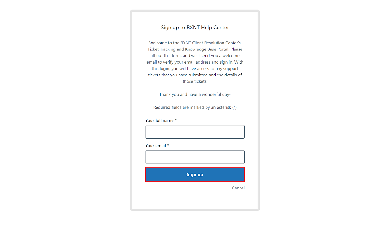 Enter your full name and email address in the designated fields. Make sure the information is accurate, as it will be used to identify your account and communicate important updates regarding your RXNT Help Center access and support requests. Then, click Sign Up.