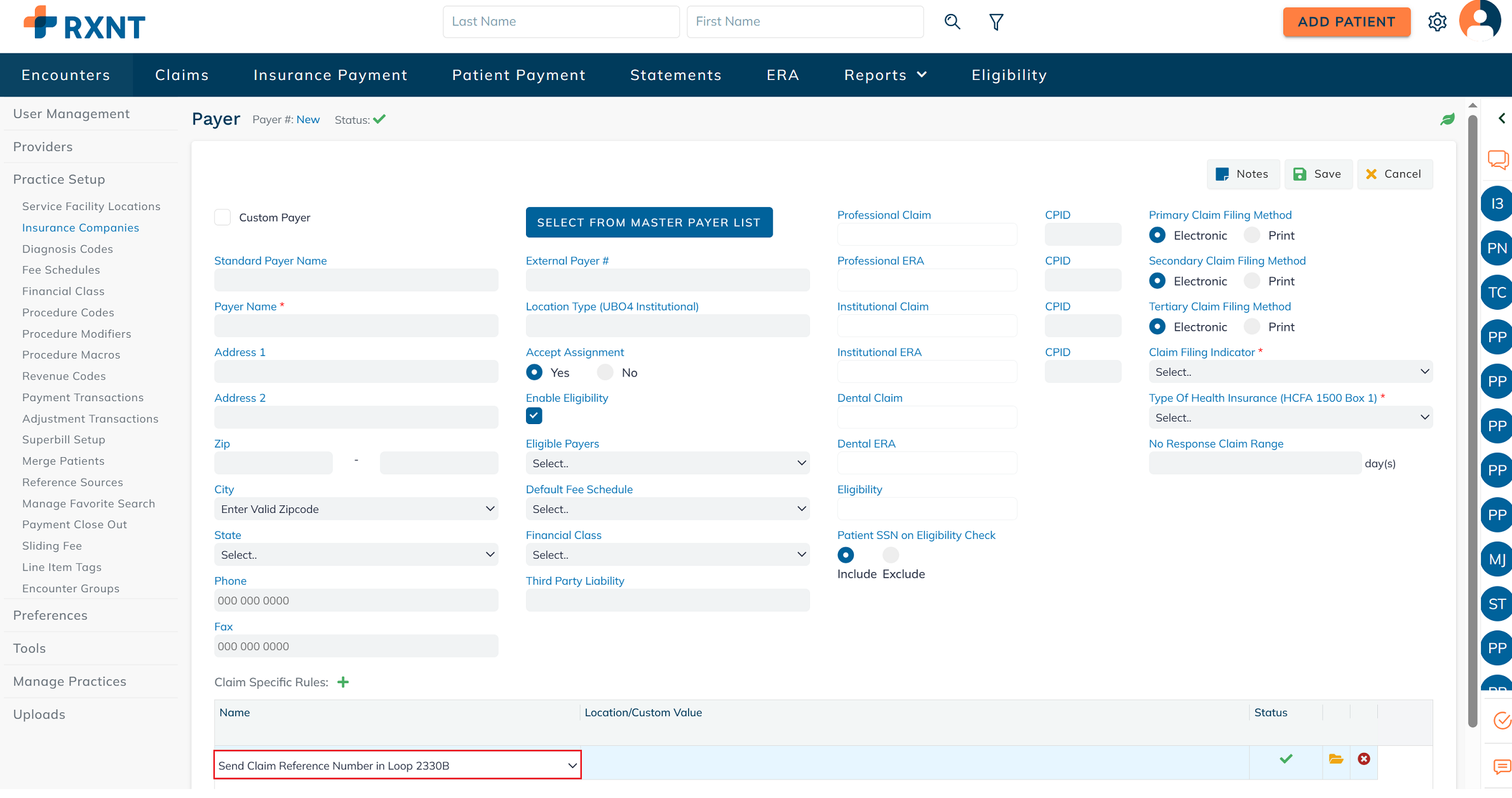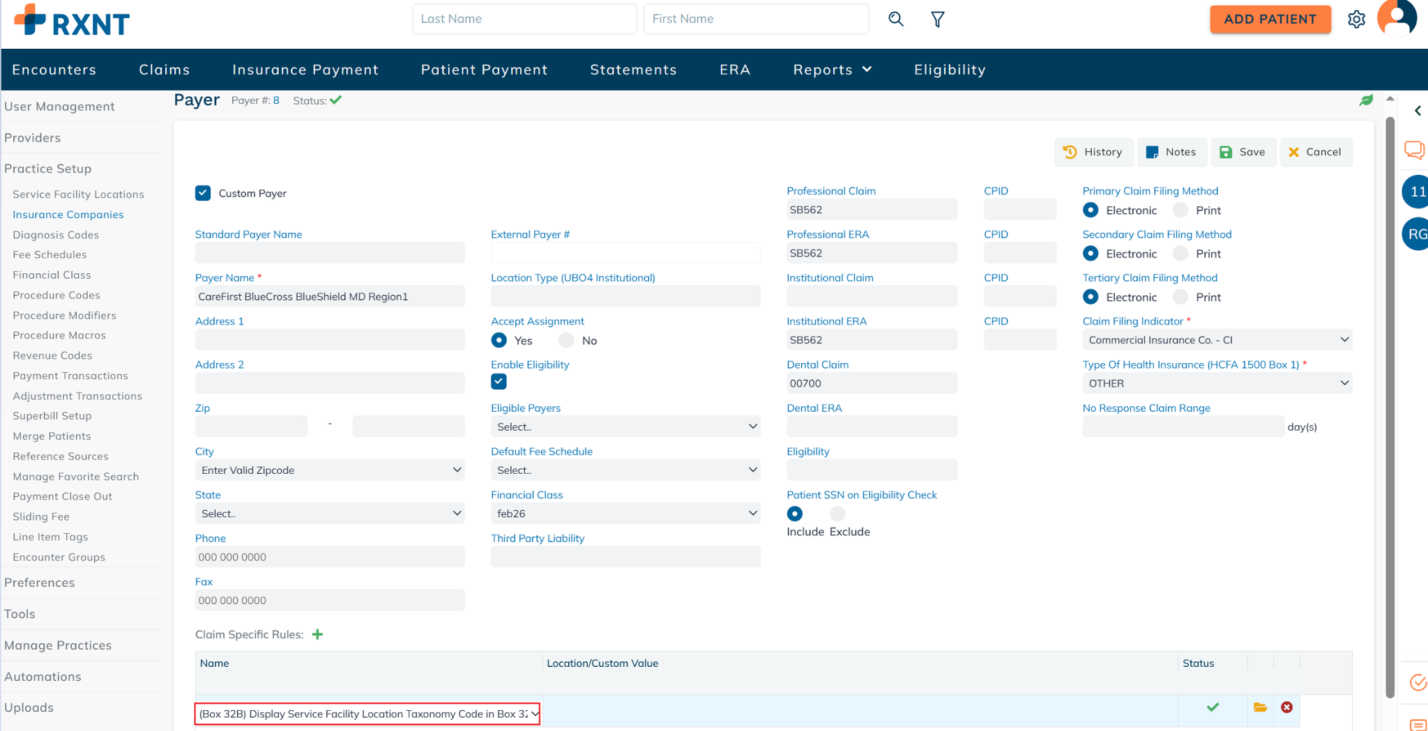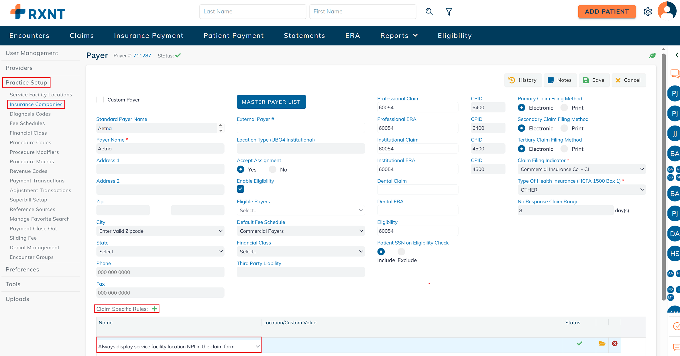 RXNT provides a list of claim specific rules that can be set up for each payer.