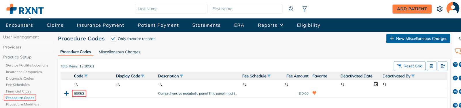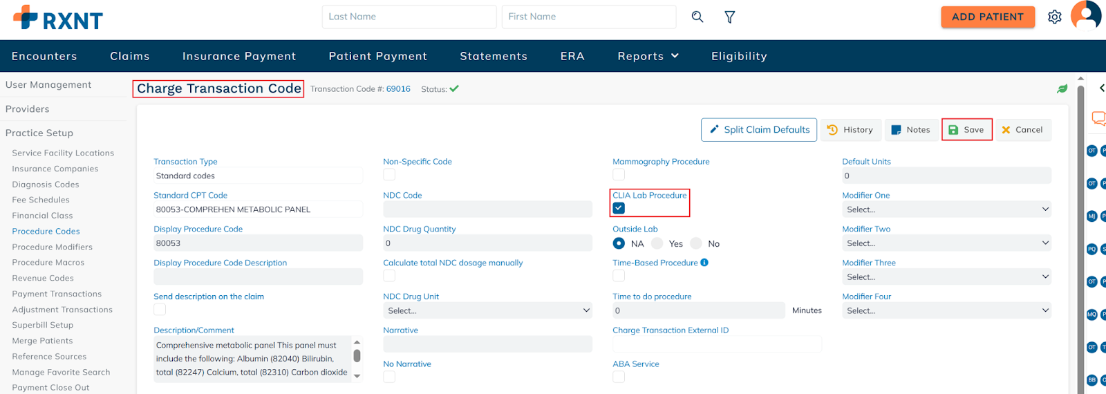 Use this rule to send the CLIA number in Box 19 of the claim form and in the EDI. To enable this rule, make sure the CLIA Lab Procedure checkbox is selected for the procedure code in the Charge Transaction Code screen. To do this, navigate to Procedure Codes, select the appropriate code, check the CLIA Lab Procedure box in the Charge Transaction Code screen, and click Save.