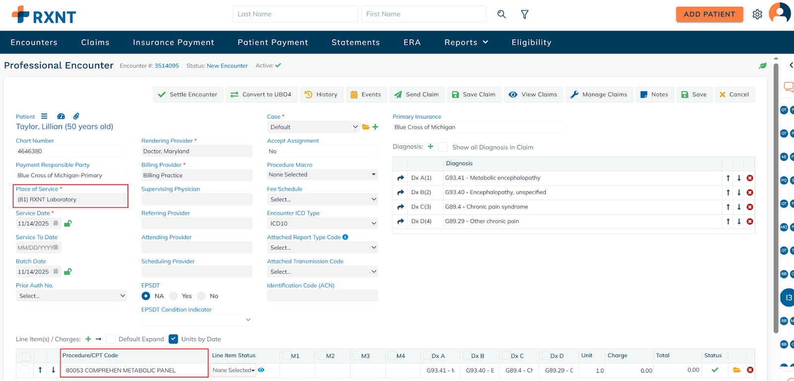 Next, click Save Claim to save the claim, or click Send Claim to submit the claim to the payer.