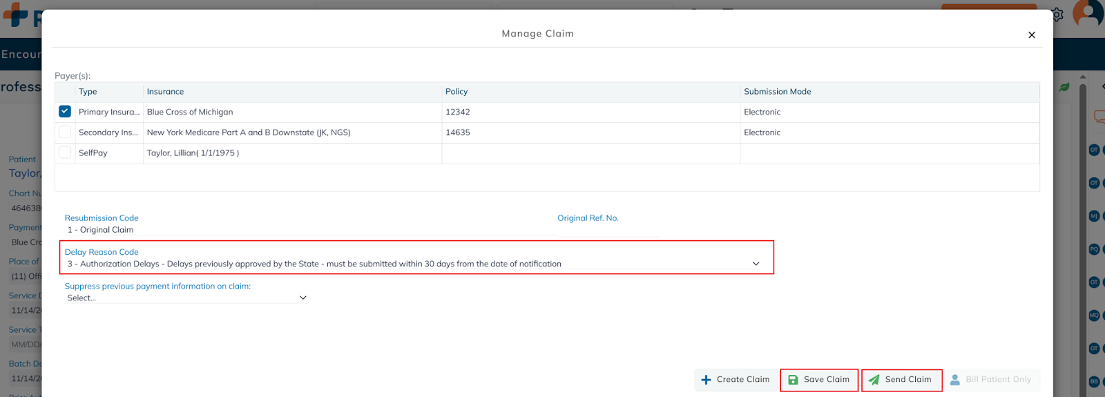 Use this rule to send a Delay Reason Code in the EDI. After setting the rule, you can select the appropriate reason code from the dropdown menu in the Manage Claims screen. For example, if a claim is delayed because the payer requires prior authorization for a procedure, you would set the rule and select the code labeled “Authorization Delays.” To access the available reason codes, navigate to the Professional Encounter screen and click Manage Claims.