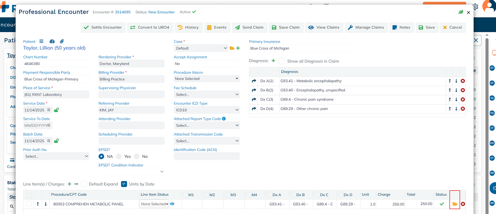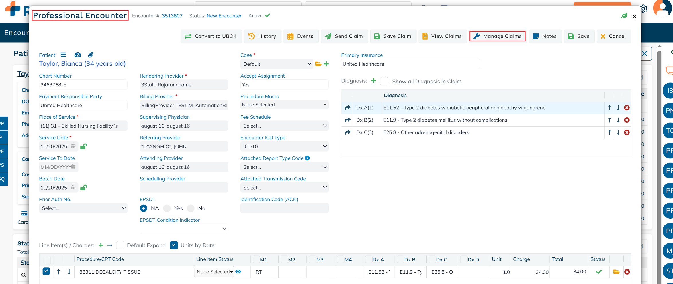 After selecting the rule, navigate to the patient’s encounter. From the Professional Encounter screen, click on Manage Claims.