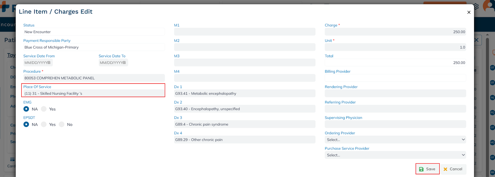 To select a second location for a line item, click the Edit folder associated with that line item. Choose the desired location from the Place of Service dropdown menu and click Save. This will ensure the line item is billed with the correct service location.