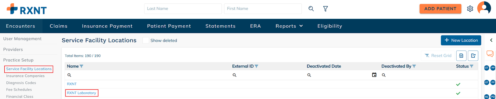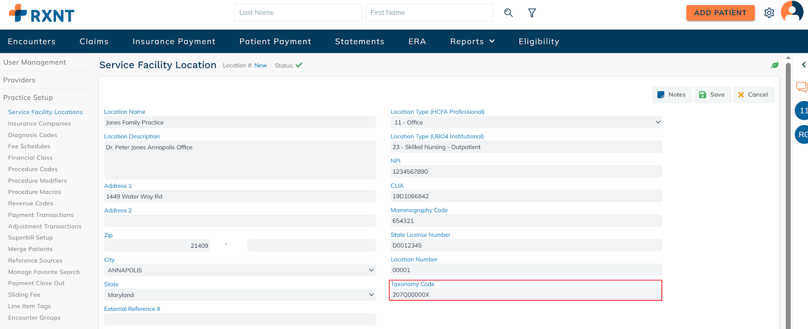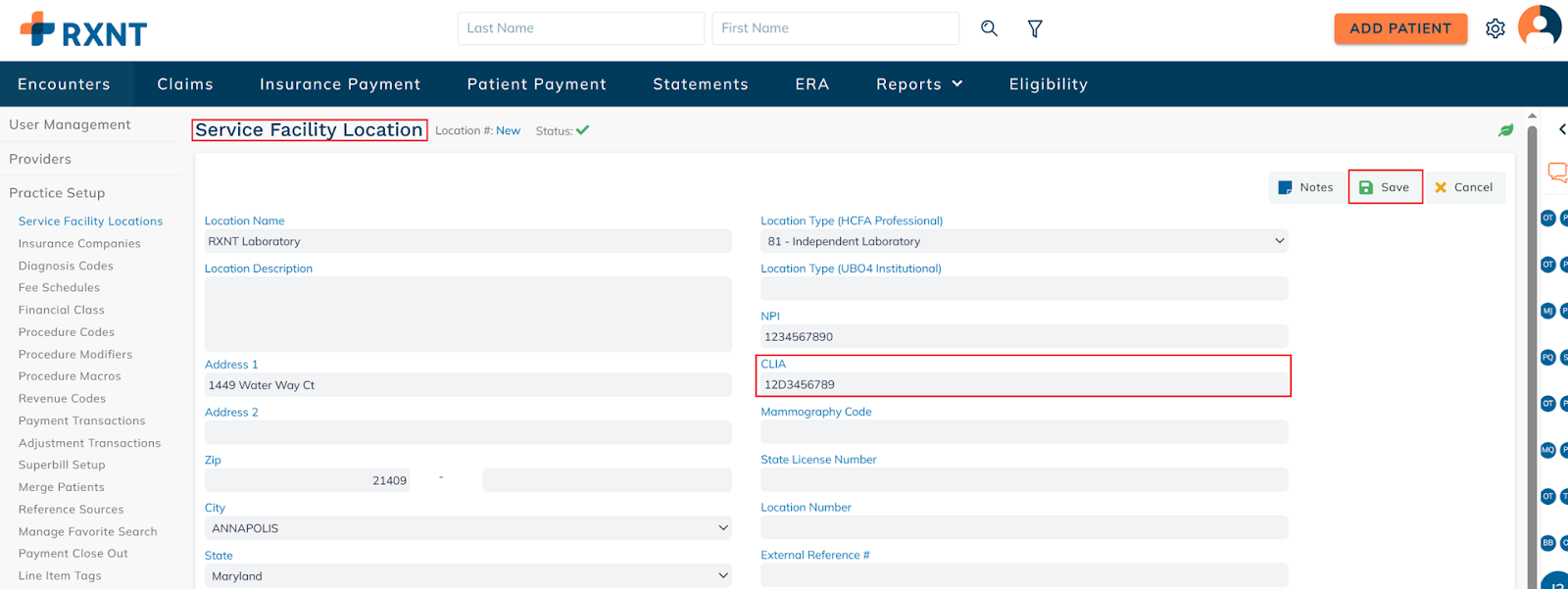 In addition, verify that the CLIA number has been entered in the Service Facility Location to ensure proper billing. To do this, navigate to Service Facility Locations and select the appropriate location. In the Service Facility Location screen, enter the CLIA number in the CLIA field and click Save.