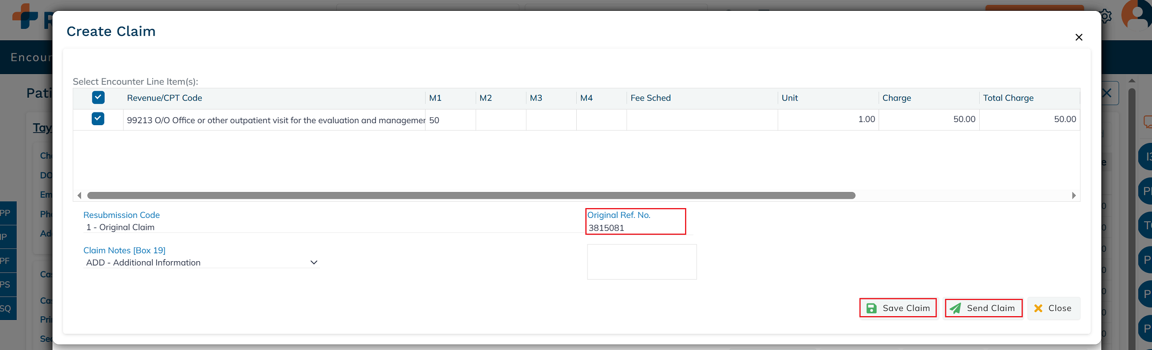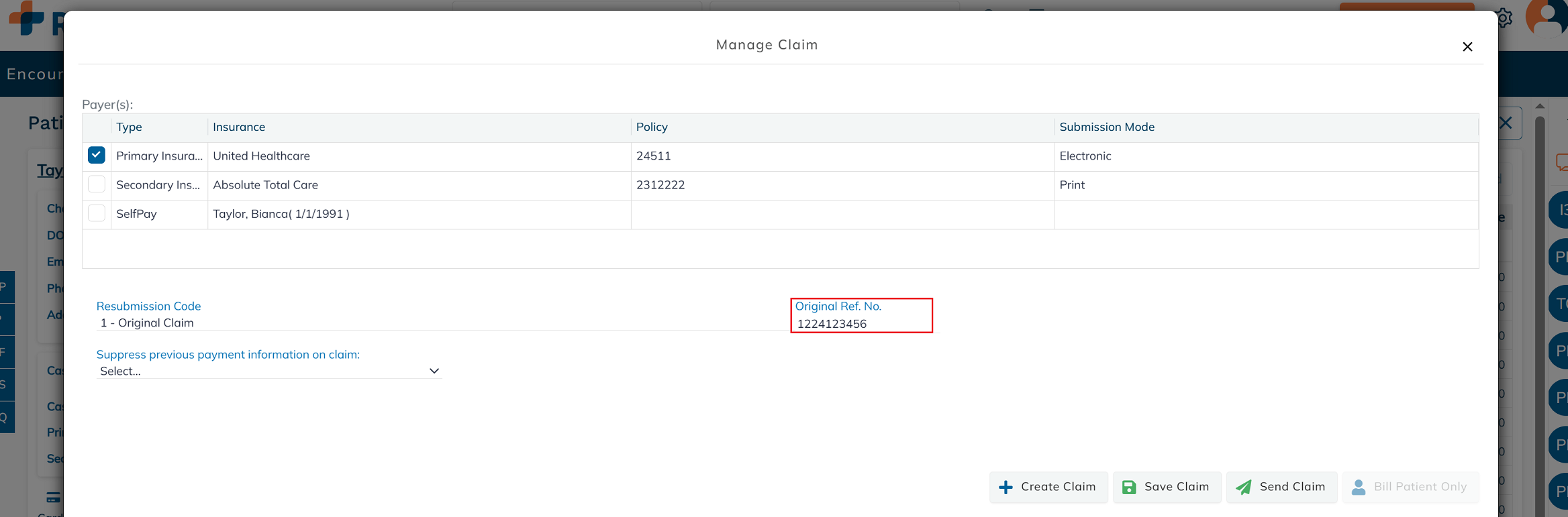 The Claim Reference Number will automatically appear in the Original Ref No field. You can update this number manually if any changes are required before submitting the claim. Then, click Save Claim to save the claim, or click Send Claim to submit the claim to the payer.