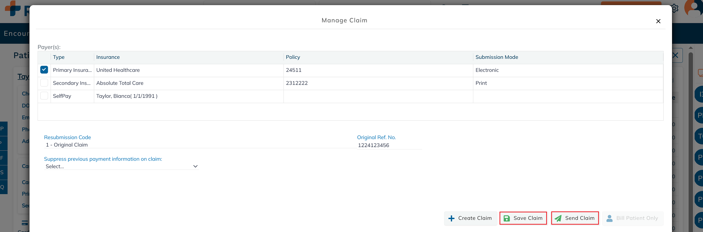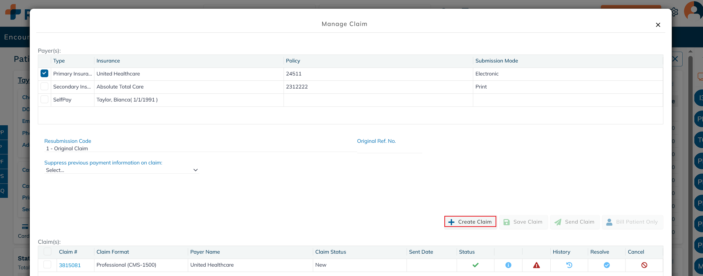 If a previous claim has already been created for the selected payer, the options to Send Claim or Save Claim will not be available. In this case, you will need to click Create Claim to generate a new claim, allowing you to enter or update the necessary information for submission.