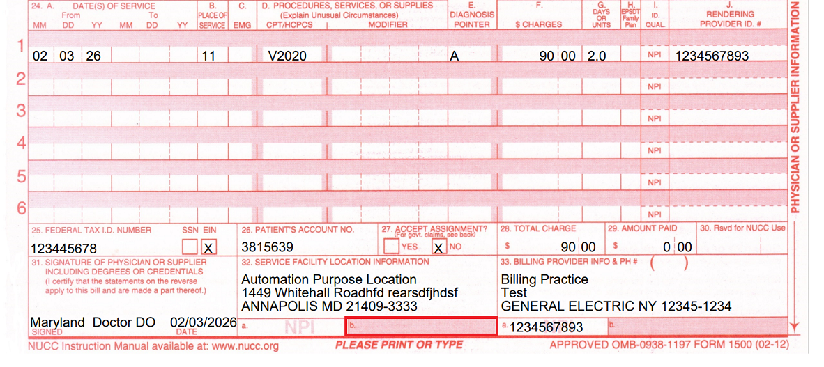 When a value is entered in the Taxonomy Code field on the Service Facility Location screen, and the claim-specific rule to display it is selected, the taxonomy code will appear in Box 32B of the printed claim form. This allows the payer to see the provider's specialty for that service facility.