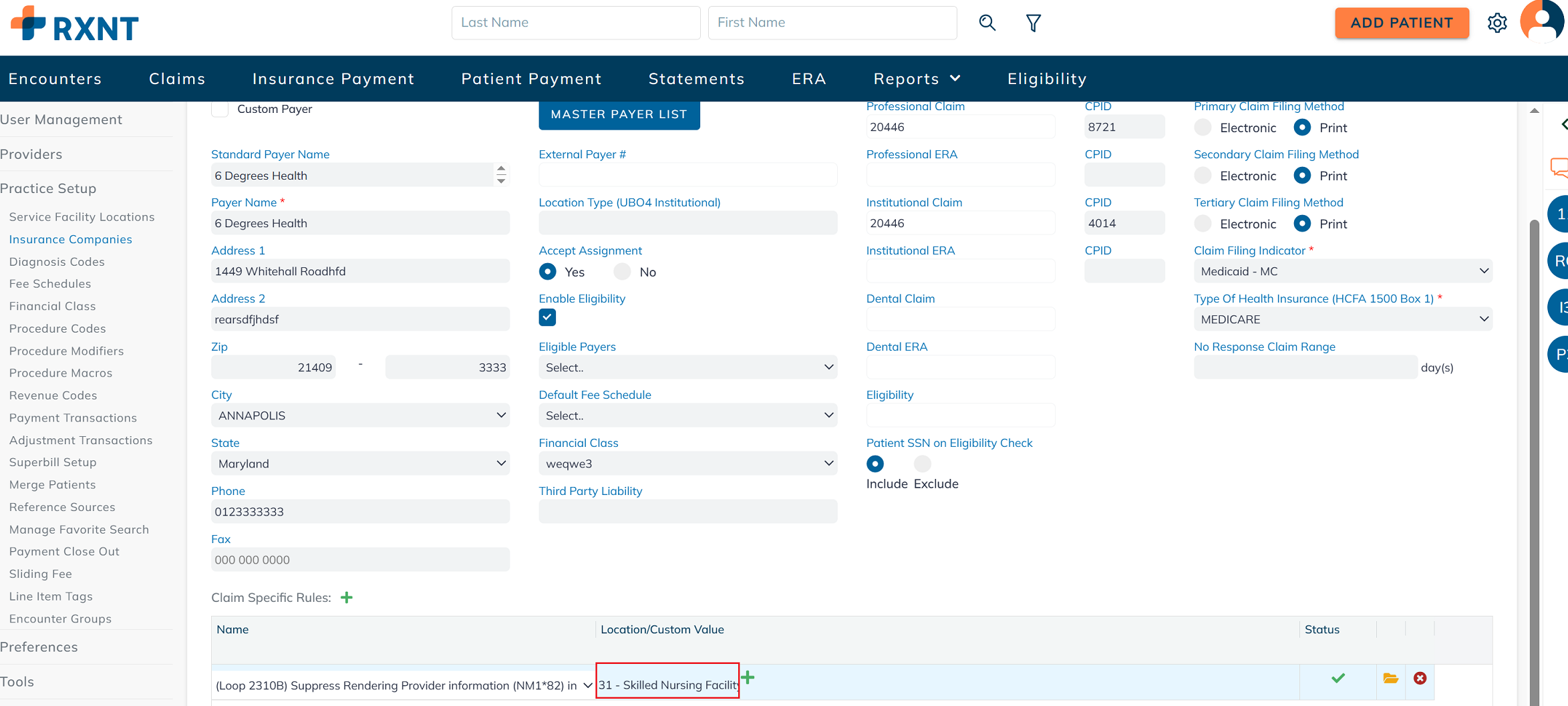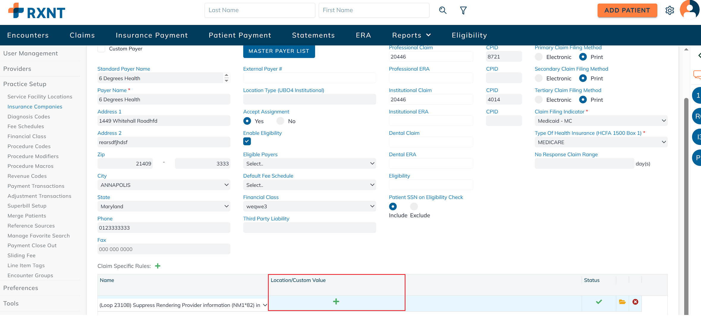 Claim specific rules are applied when a payer requires certain information to appear in a particular section of the claim form. These rules must be set up individually for each insurance company whenever you need to adjust what is displayed on the CMS-1500 claim form or the institutional claim form. When adding or editing a payer in the Insurance Companies section of Practice Setup, you can create or modify claim-specific rules at the bottom of the screen.