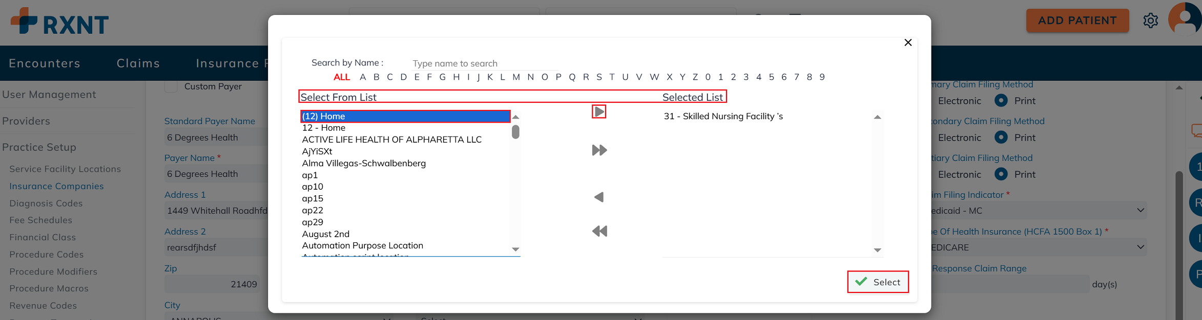 Select the desired location(s) from the Select From List, then click the arrow to move them to the Select List. Click Select to confirm. This ensures the rule is applied only to claims associated with the selected locations.