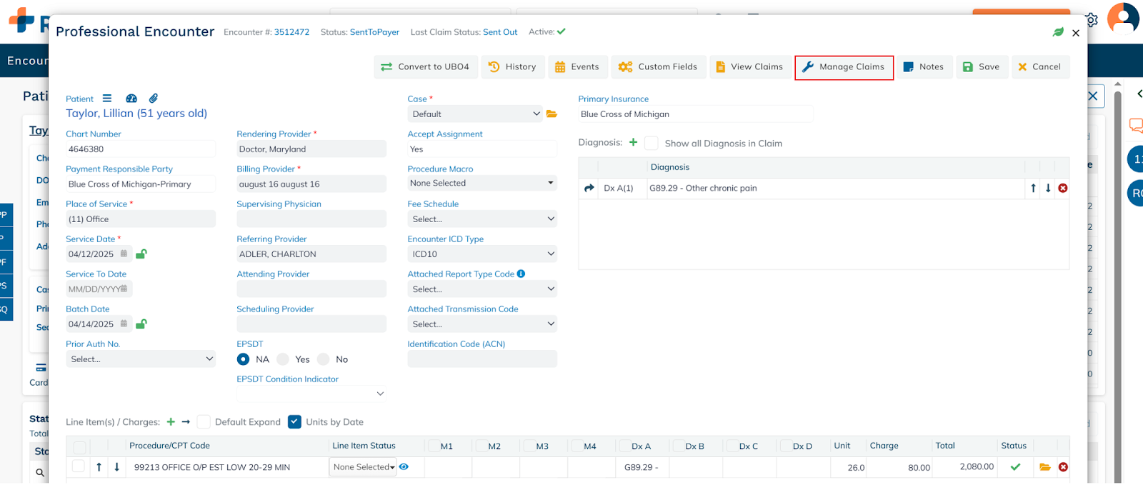 Once the necessary edits are complete, click Manage Claims on the Professional Encounter screen.