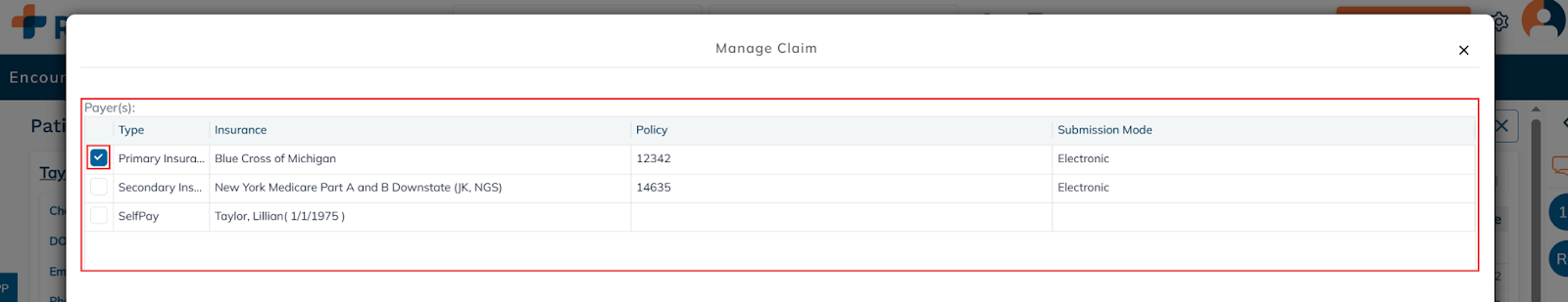 On the Manage Claim screen, in the Payer(s) section check the box next to the Payer.