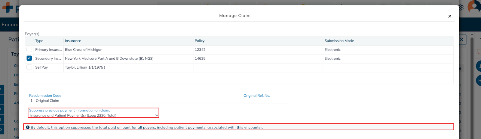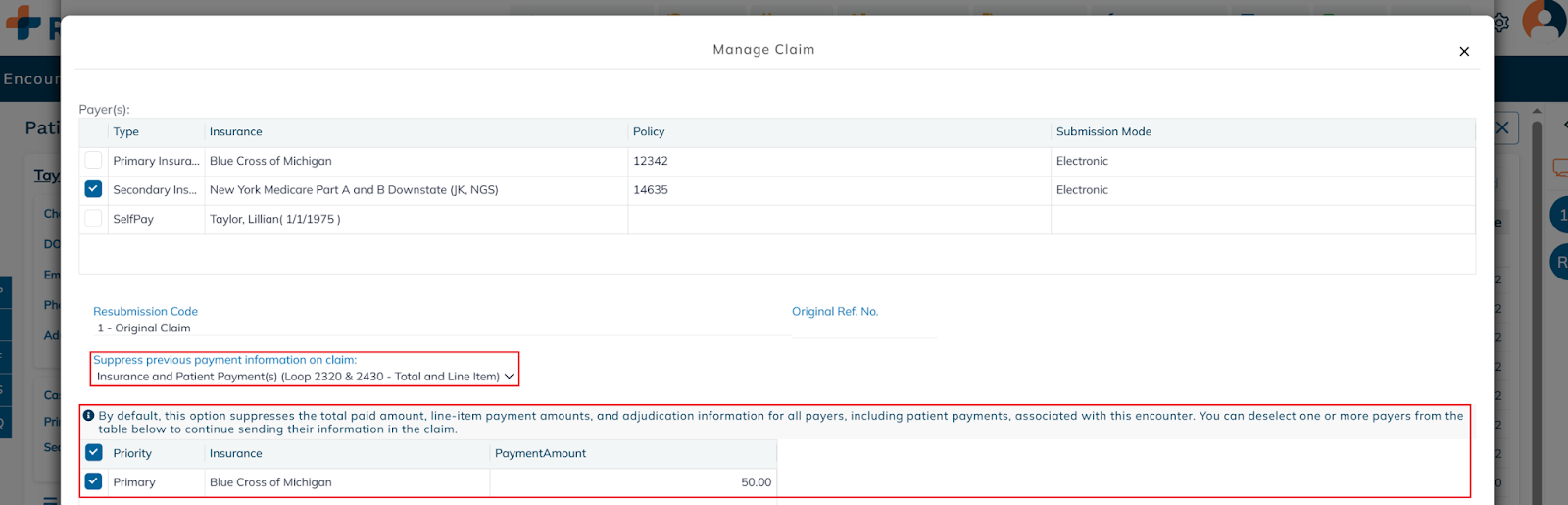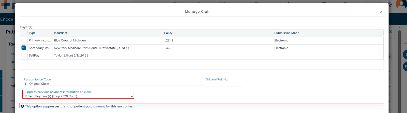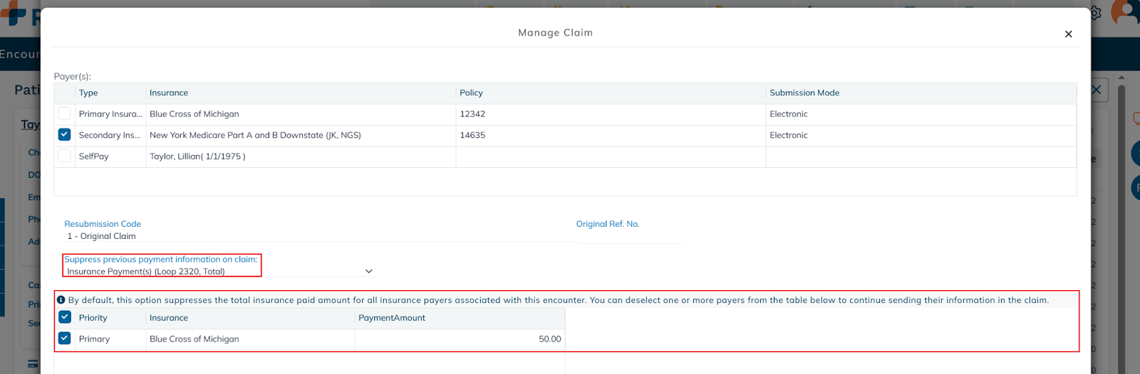Use this option to suppress the total insurance paid amount for all insurance payers associated with this encounter. When selected, a list of associated payers will appear. You may deselect specific payers to prevent their payment amounts from being included on the claim or transmitted in the EDI file.