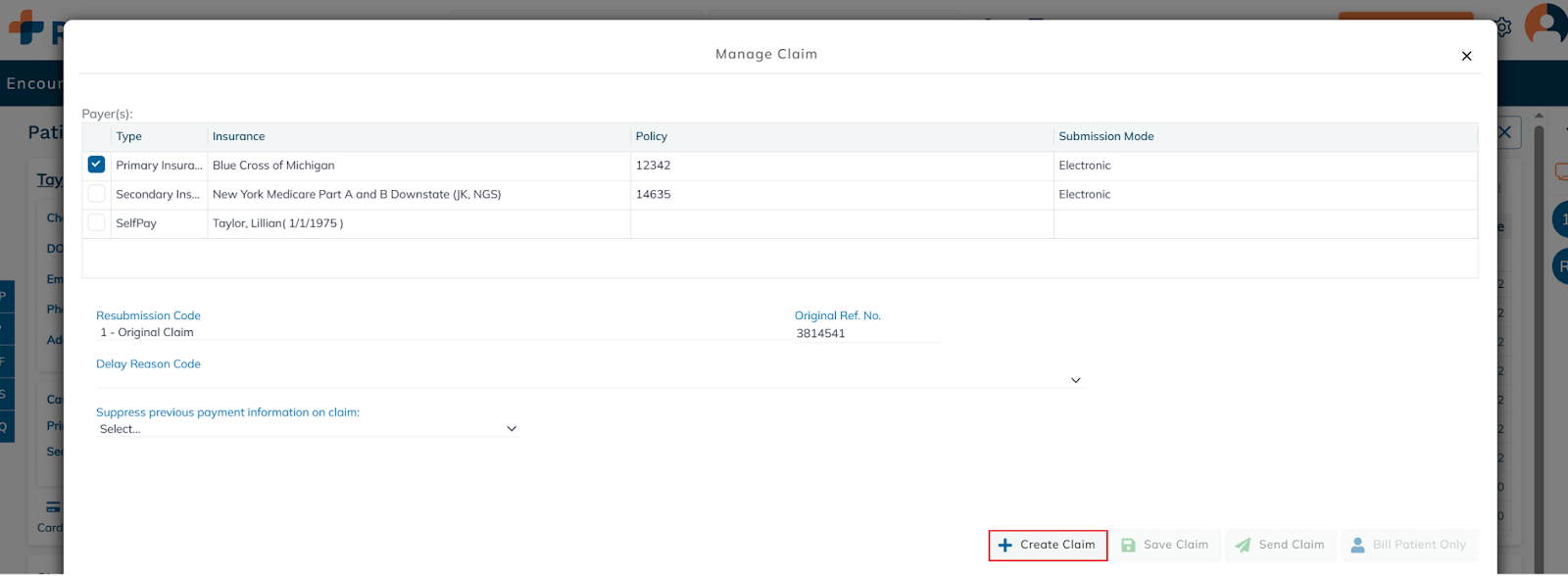 Creating a new claim for resubmission is a simple and efficient process that can be done directly from the Manage Claims screen. For example, if a claim has been rejected or denied and edits were made in the Professional Encounter screen, Patient Case, or Patient Profile, you will need to create a new claim to resubmit it.