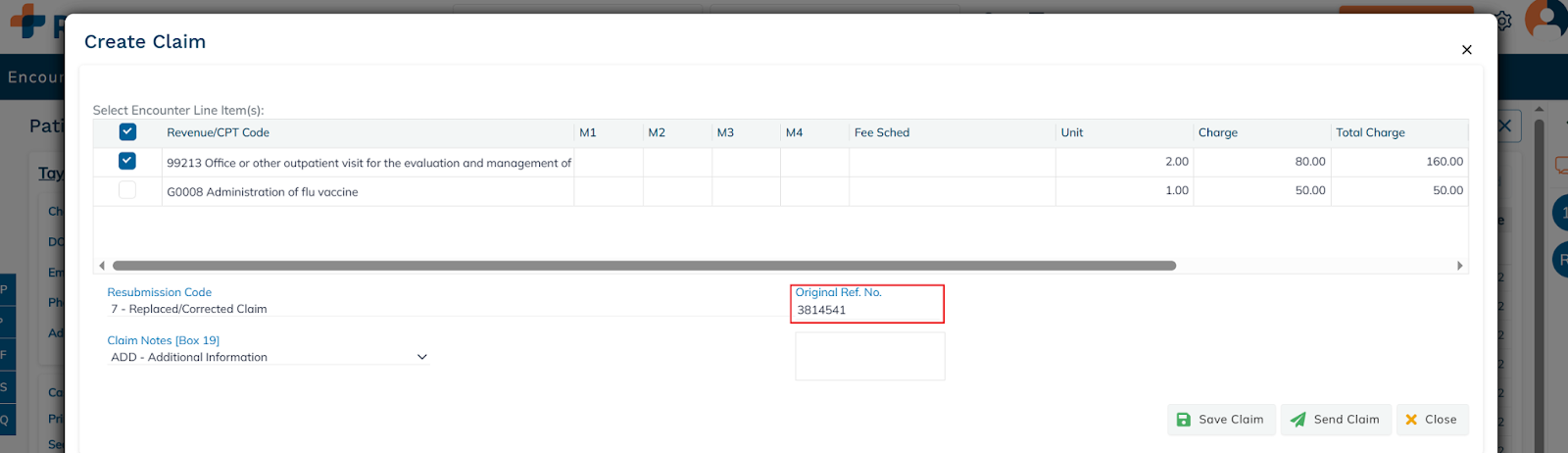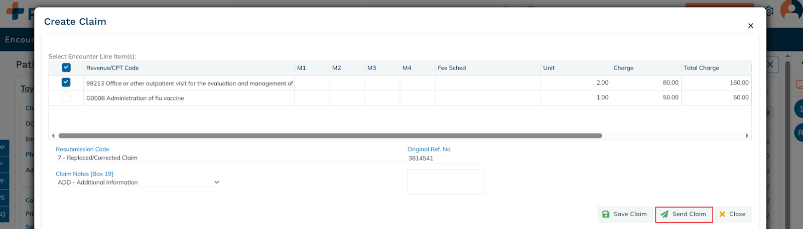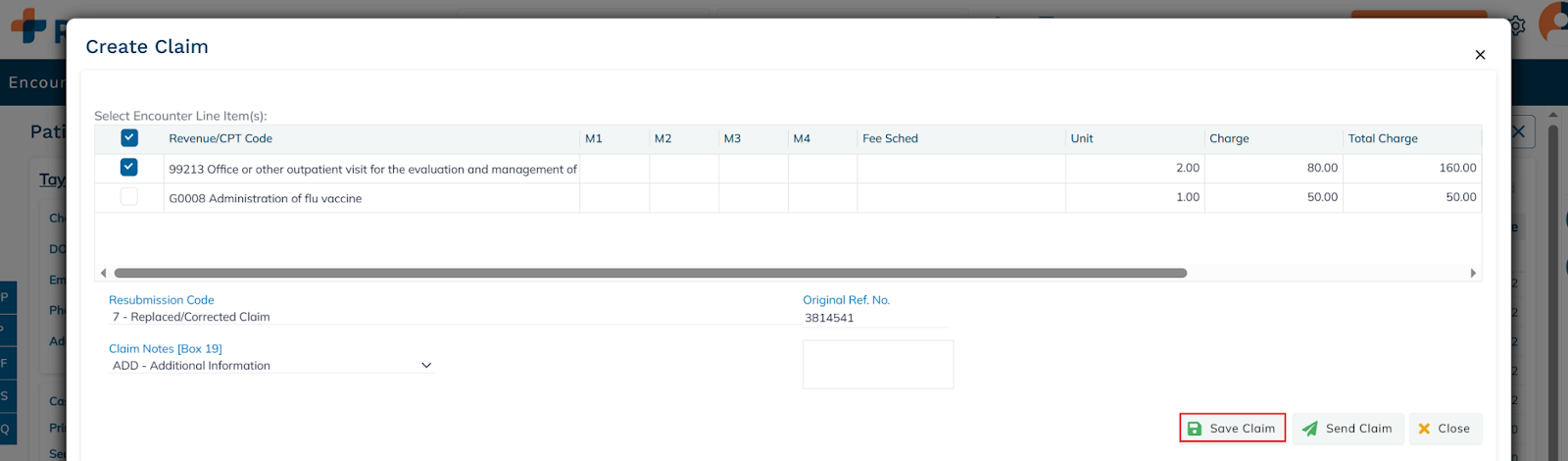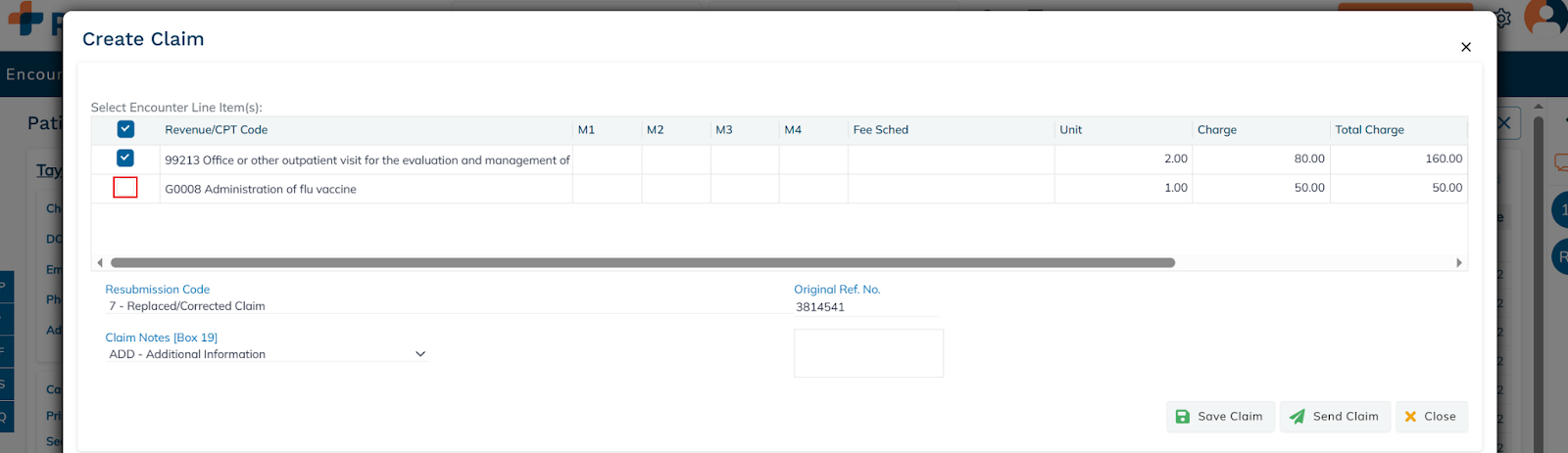 On the Create Claim screen, you can manage the claim details before resubmission. Deselect any CPT codes that do not need to be resubmitted, select the appropriate resubmission code, and edit or remove the original reference number if necessary. To exclude a CPT code from resubmission, simply click the checkbox next to it.
