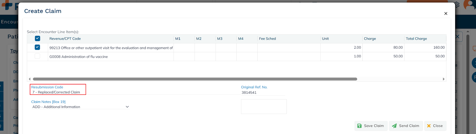 Select the appropriate Resubmission Code from the dropdown menu. This code indicates the reason for resubmitting the claim and ensures that the payer correctly identifies it as a corrected or replacement claim.