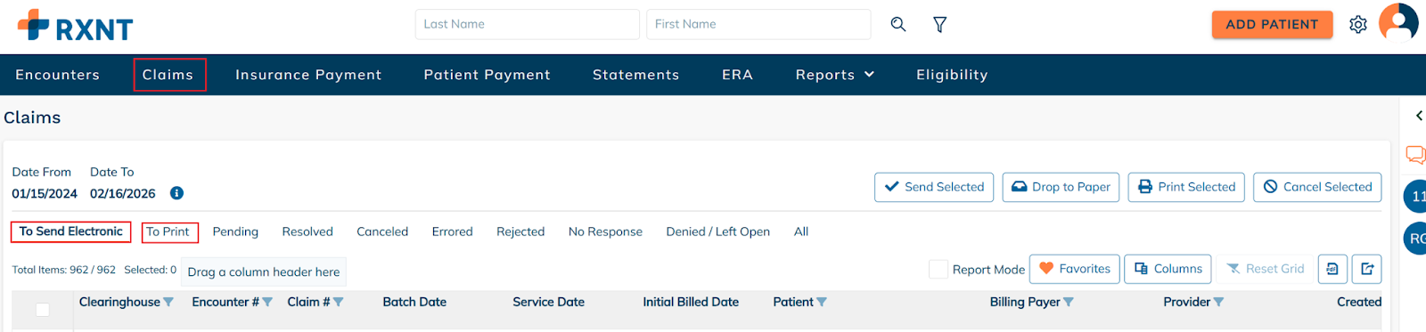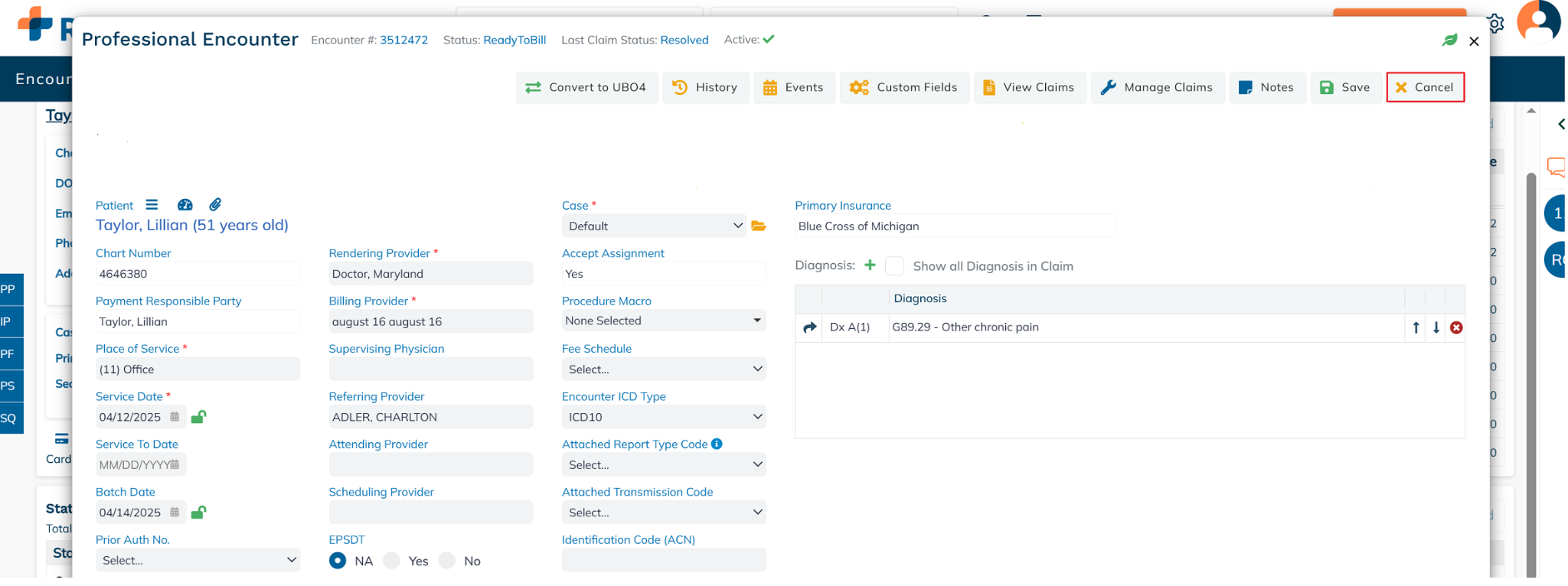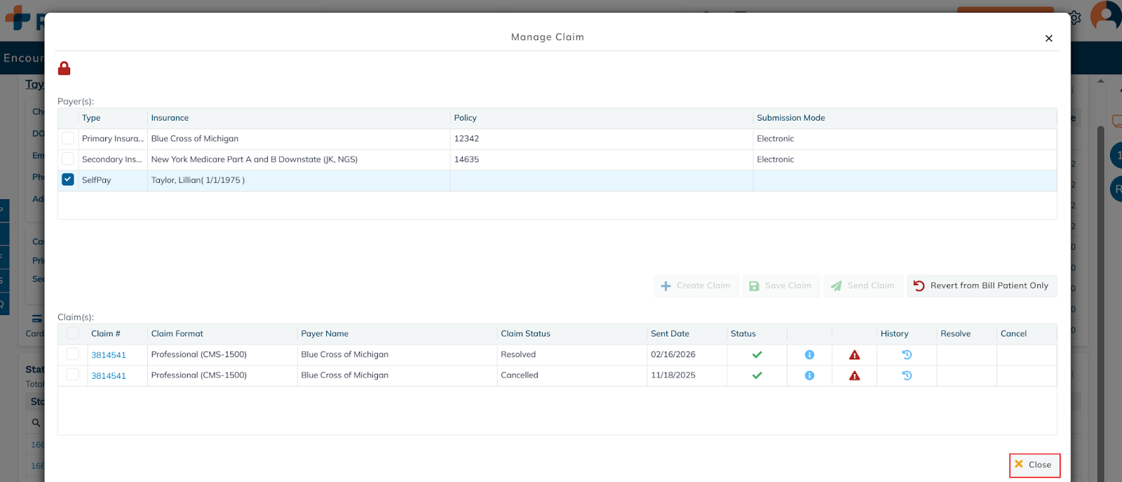 Managing claims is a critical component of the billing workflow. It enables you to review and correct claim information, resubmit rejected or denied claims, or designate a claim as Bill Patient Only when appropriate. These actions help ensure timely reimbursement and minimize payment delays.