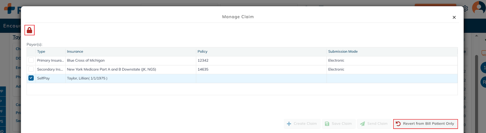 Once the update is complete, the Manage Claim screen will display a lock icon, indicating the claim is now set to Bill Patient Only. You will also see an option to Revert from Bill Patient Only if you need to undo the change.
