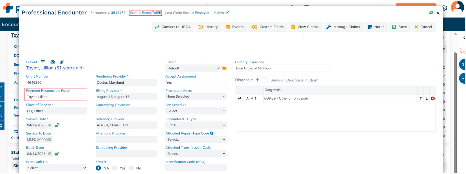 The Professional Encounter screen will display the patient’s name in the Responsible Party field, indicating that the patient is now financially responsible for the balance. The encounter status will also update to ReadyToBill, confirming that the charge is prepared for patient billing.