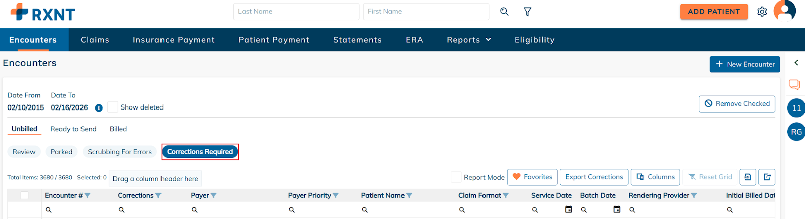 The system will then automatically scrub the claim for errors. If correction are needed, the encounter will be moved to the Corrections Required tab. You’ll need to make the corrections before the claim can be submitted.