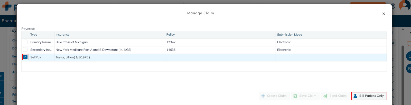 On the Manage Claim screen, select the SelfPay checkbox, then click the Bill Patient Only option.