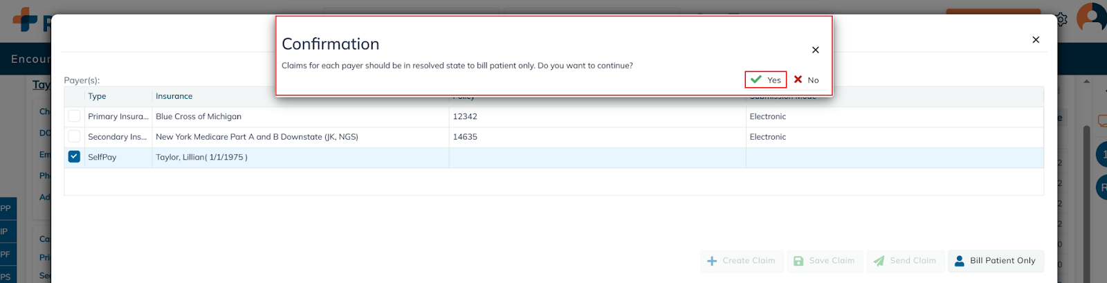 A confirmation pop-up will appear indicating that all payer claims must be in a resolved status before billing the patient only. Click Yes to continue.
