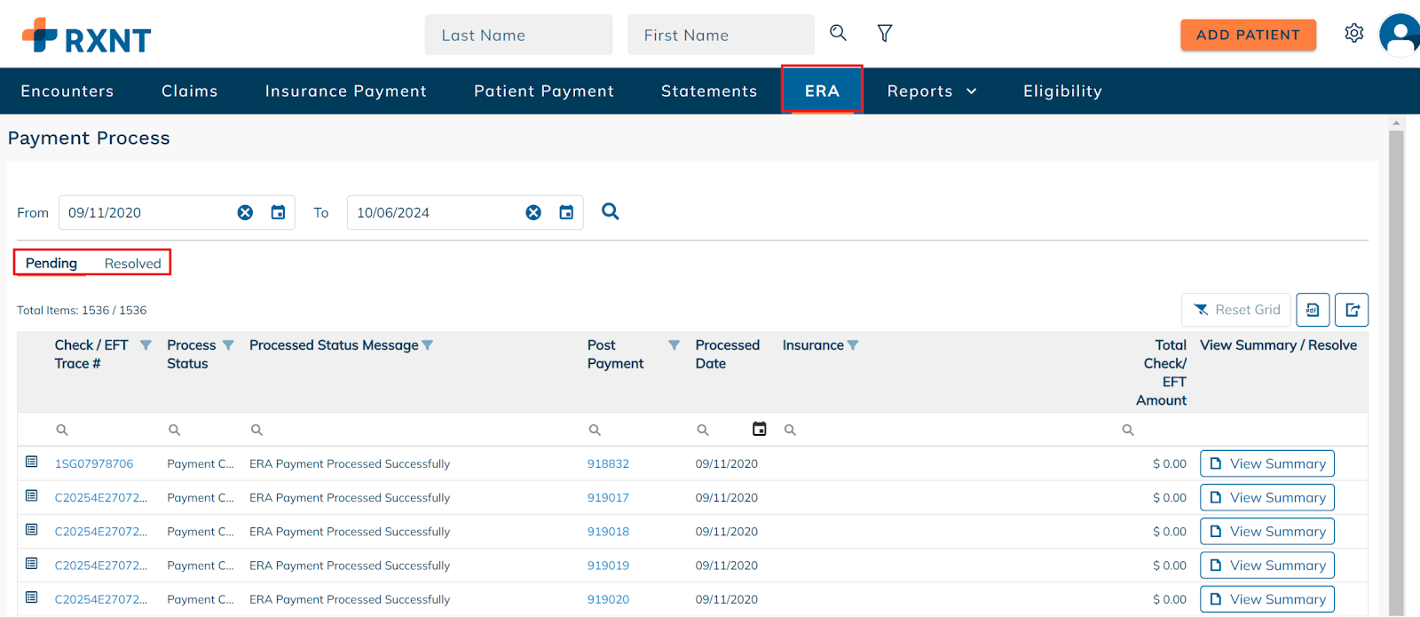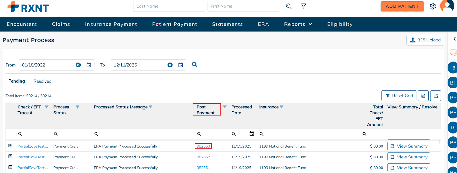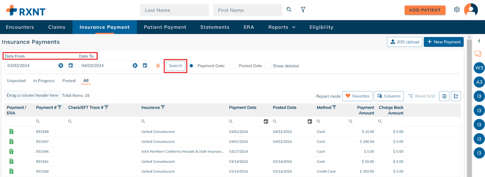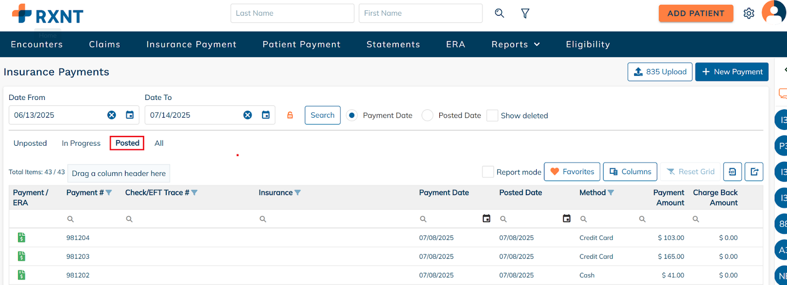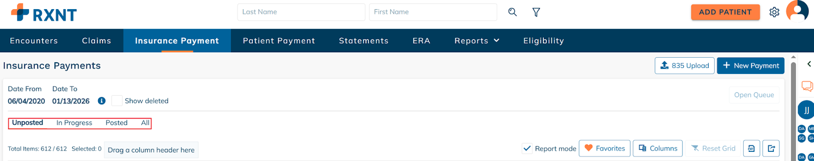 - Unposted – Payments ready to be reviewed and posted (ERAs and saved manual payments)