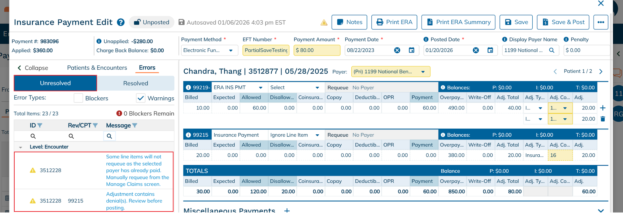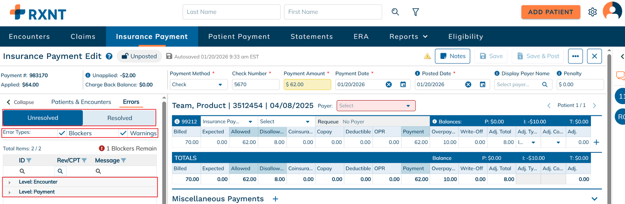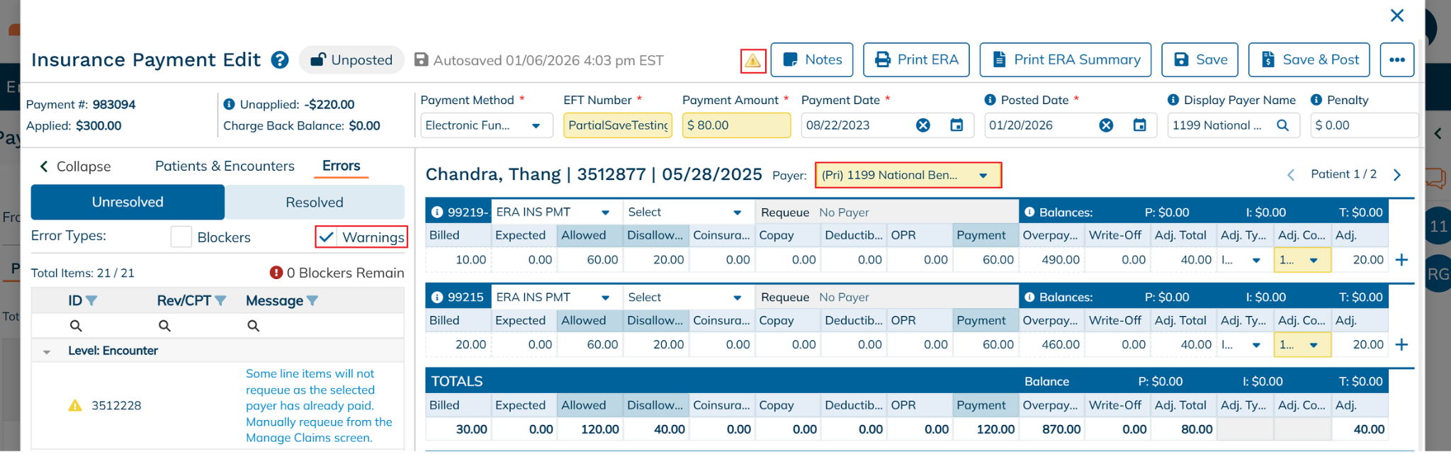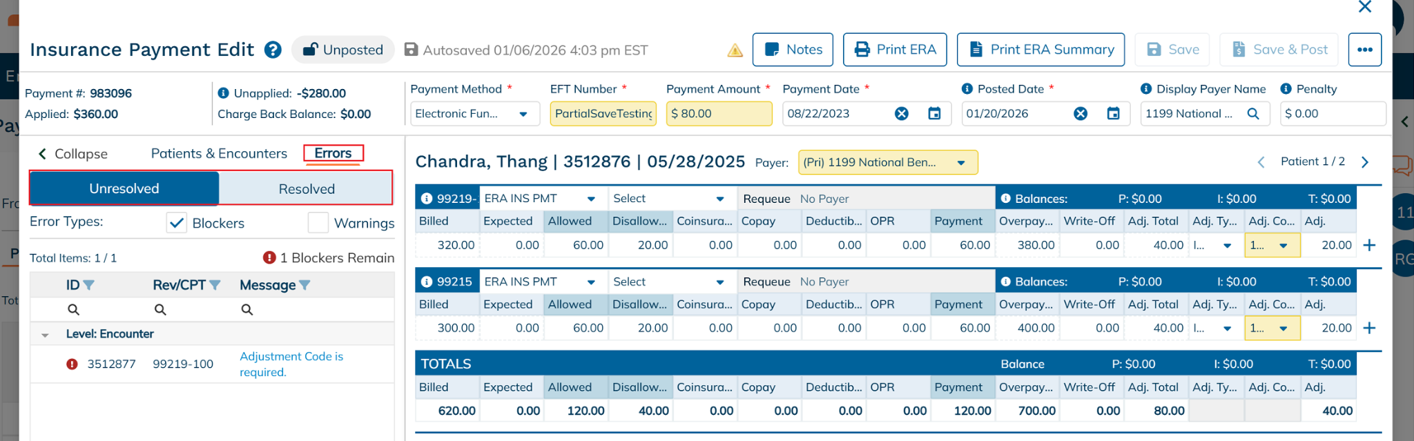 - Encounter-Level Blocker: A special blocker occurs when an ERA payment is received at the encounter level. This error is displayed in the error banner and can be resolved by clicking the Resolve button.
