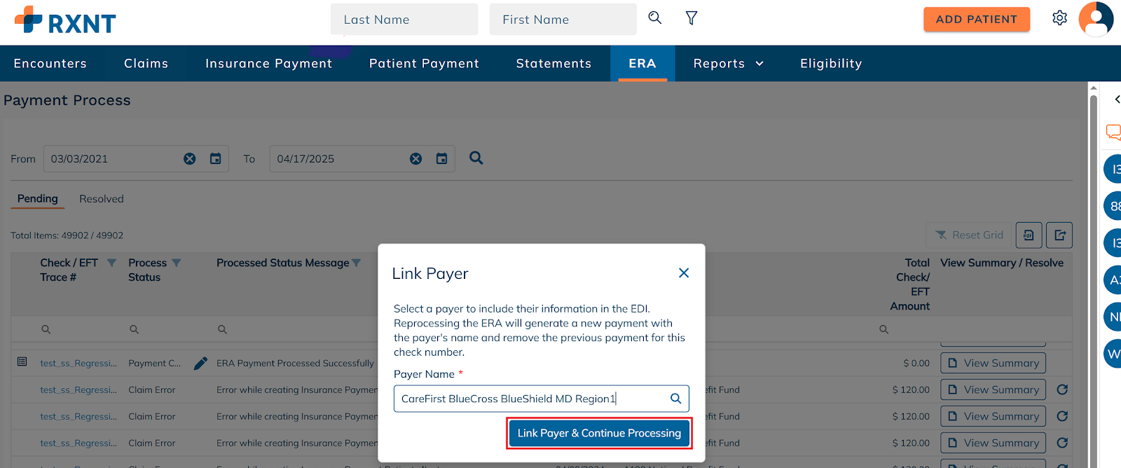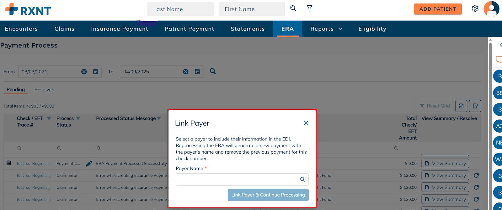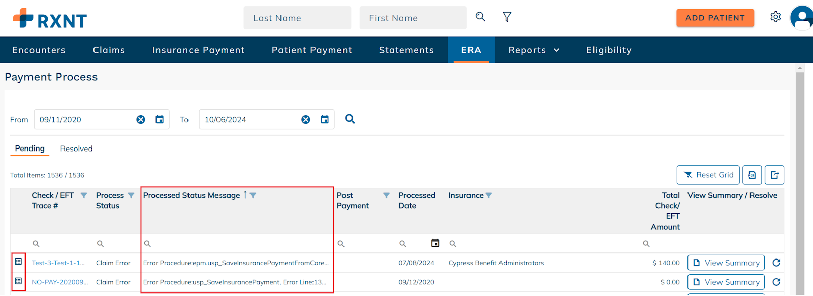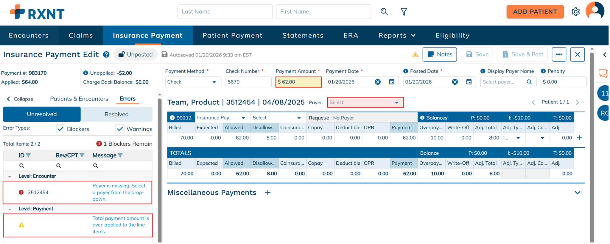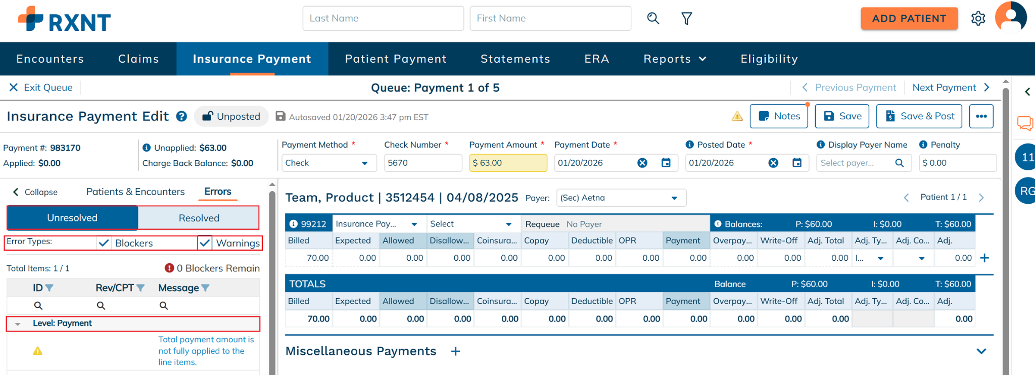 - Encounter-Level Blocker: A special blocker occurs when an ERA payment is received at the encounter level. This error is displayed in the error banner and can be resolved by clicking the Resolve button.