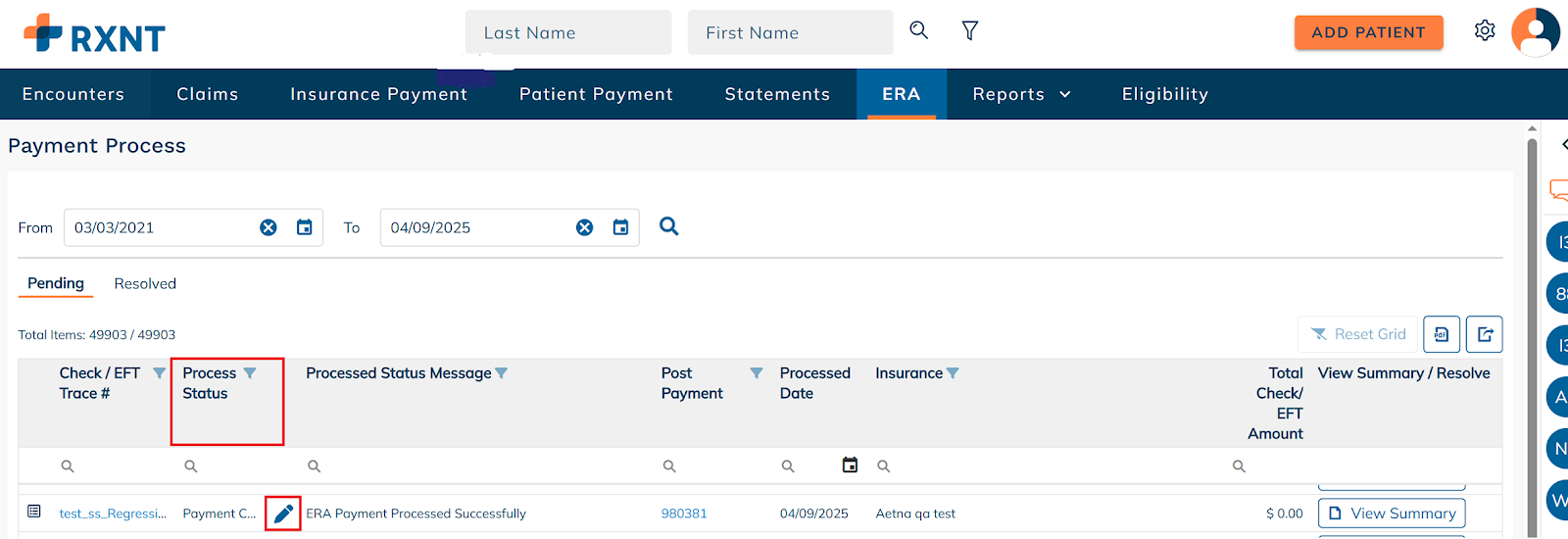 When an ERA comes in with missing payer information, an Edit Icon will appear next to the Process Status column.