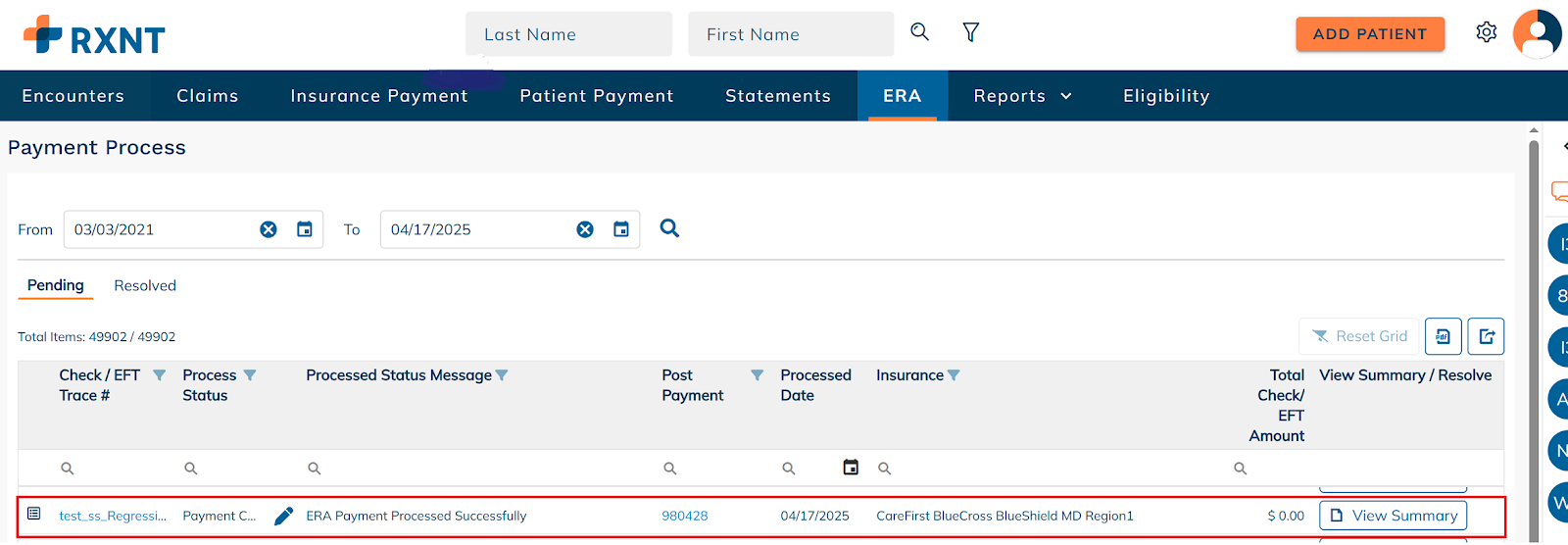 Click the Payment Number under the Posted tab for a successfully processed ERA.