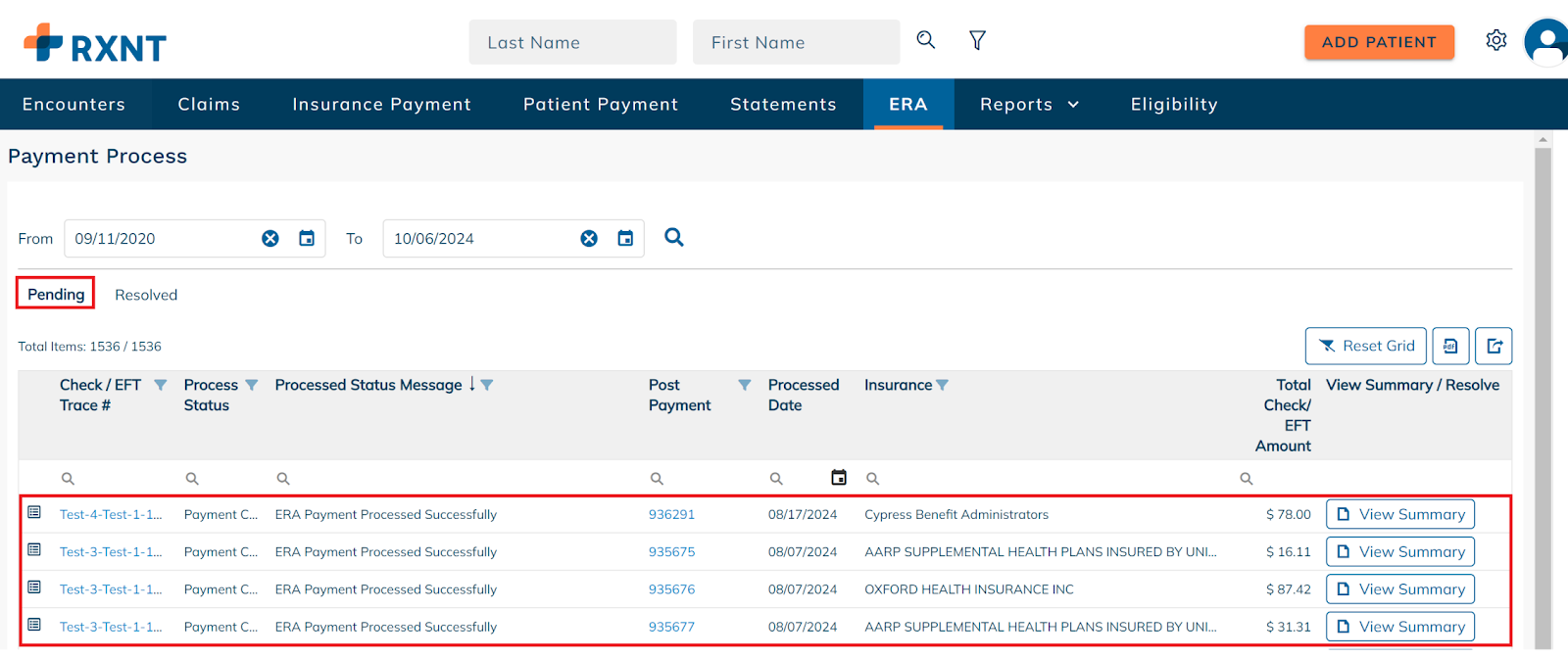 In the Pending tab, you will see a list of ERAs that have been successfully processed as well as those that contain errors.