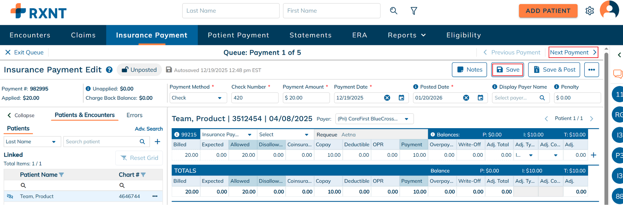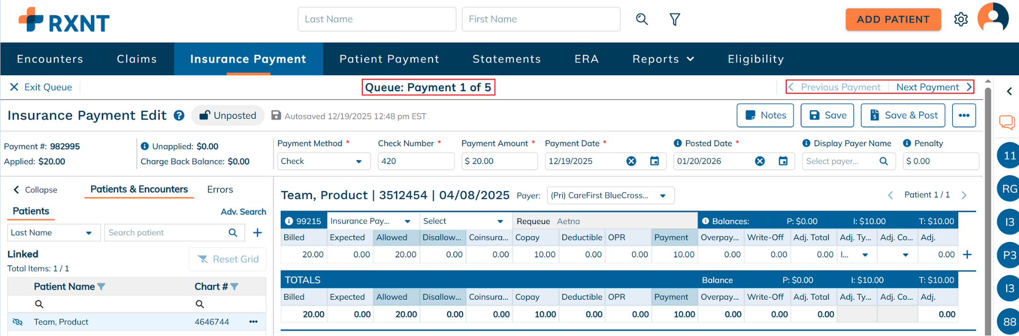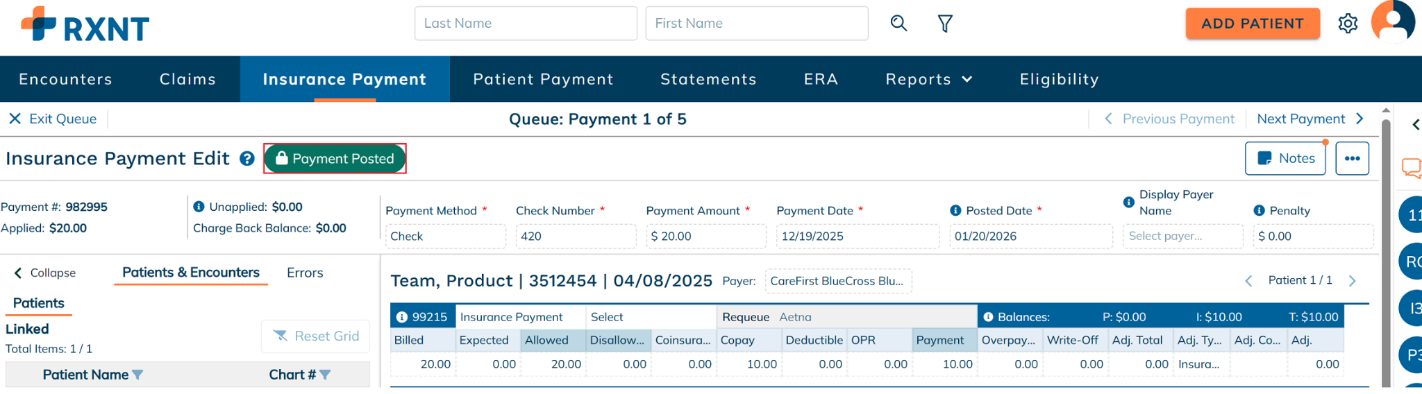 A queue containing the selected insurance payments will open automatically, displaying the first payment on the screen along with the total number of payments selected. From this view, you can review, edit, and post each payment individually. Click Next Payment to move through the remaining payments in the order they were selected, or click Previous Payment to return to a payment you’ve already reviewed.