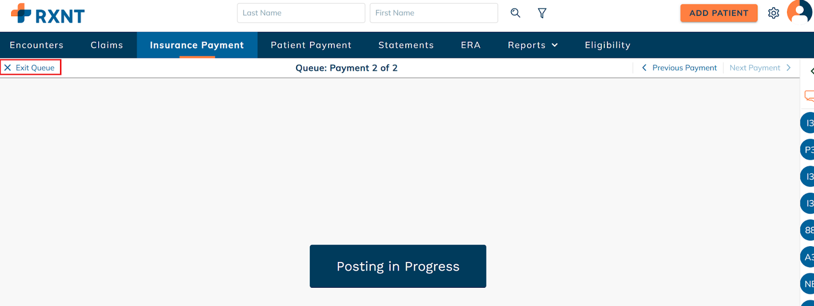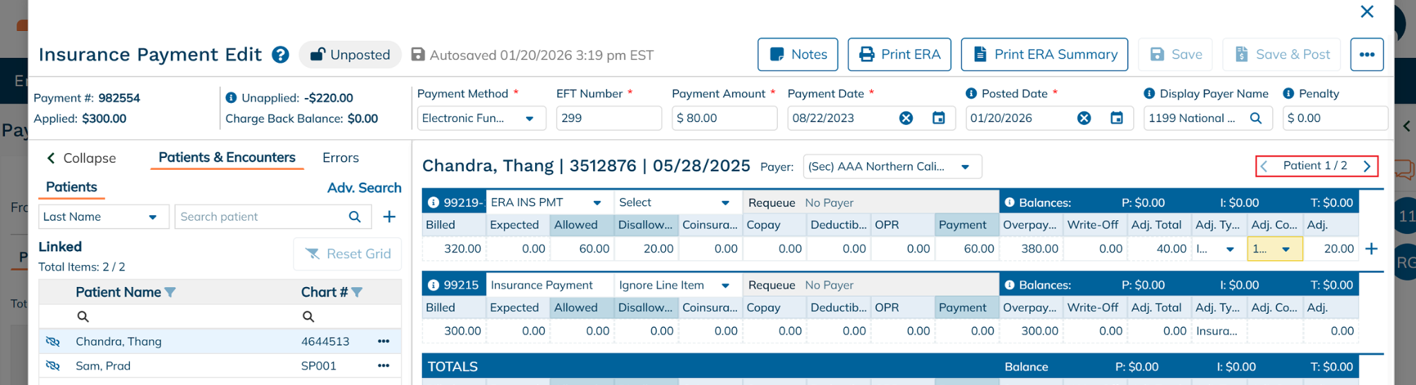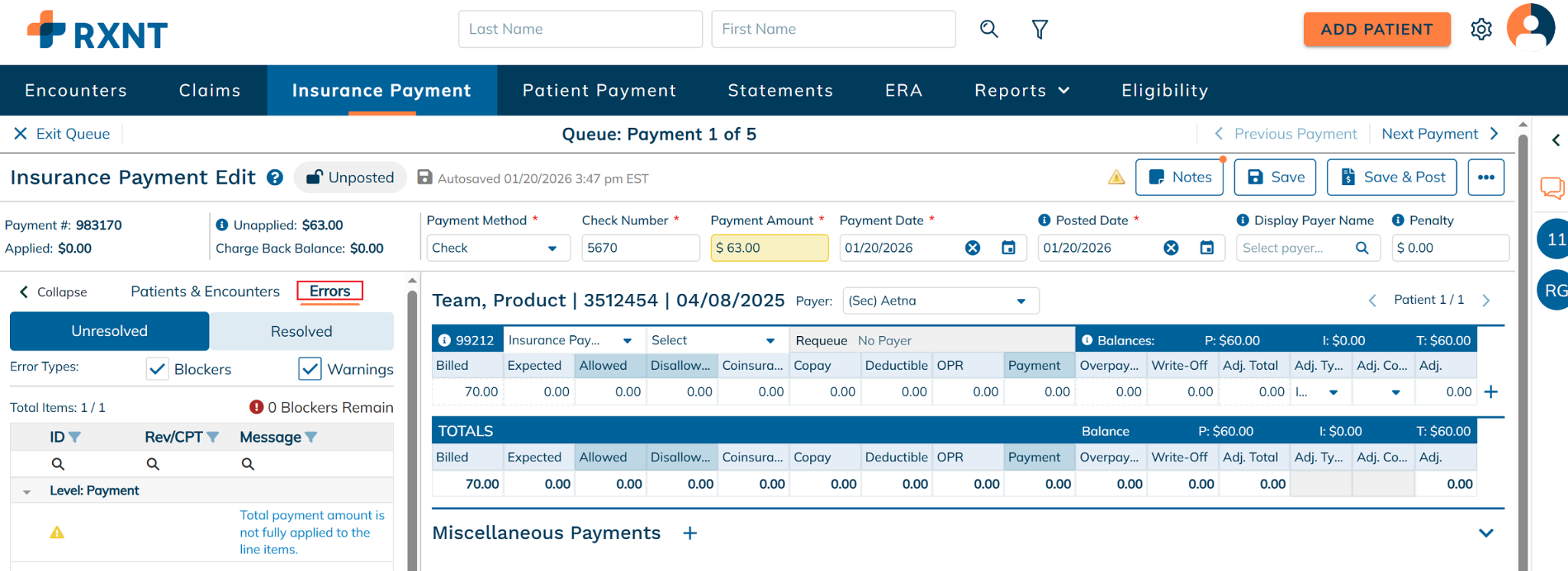 A queue containing the selected insurance payments will open automatically, displaying the first payment on the screen along with the total number of payments selected. From this view, you can review, edit, and post each payment individually. Click Next Payment to move through the remaining payments in the order they were selected, or click Previous Payment to return to a payment you’ve already reviewed.