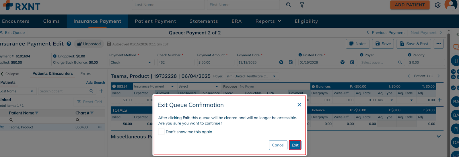 A confirmation message will appear, informing you that once you exit, the queue will no longer be accessible. If you choose to continue, click Exit to confirm. You will then be redirected back to the Unposted tab, where you can return to the remaining payments at a later time if needed.