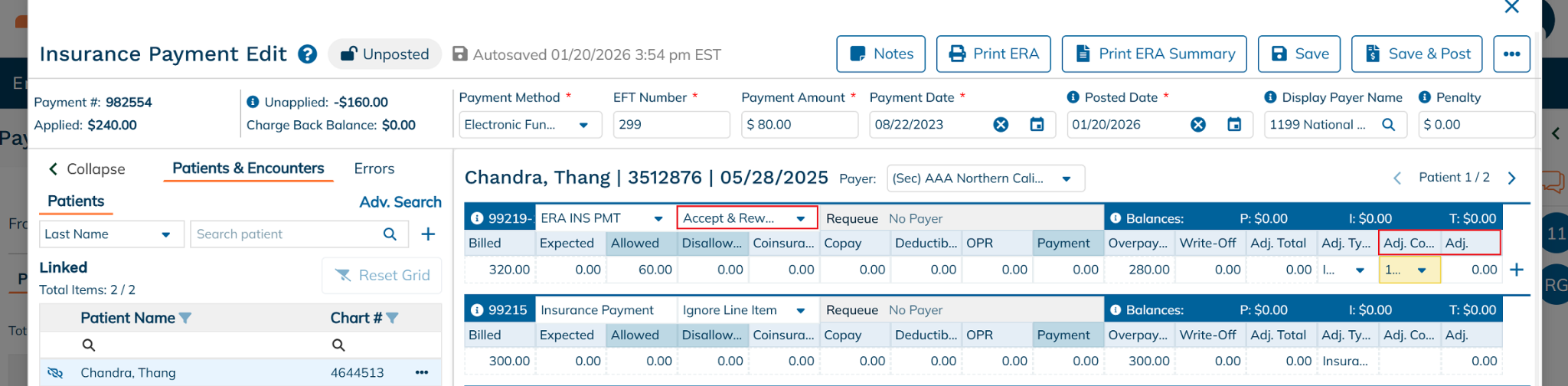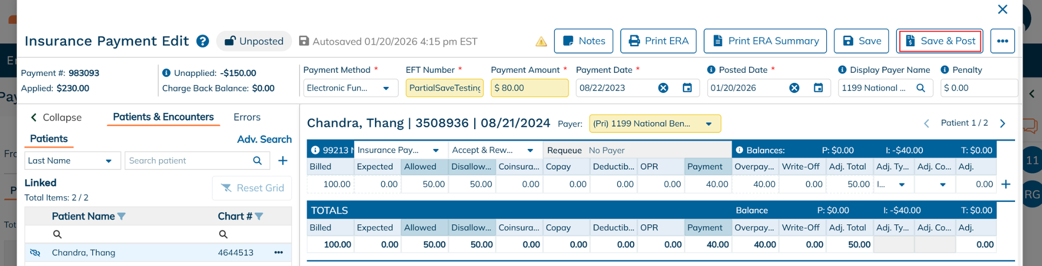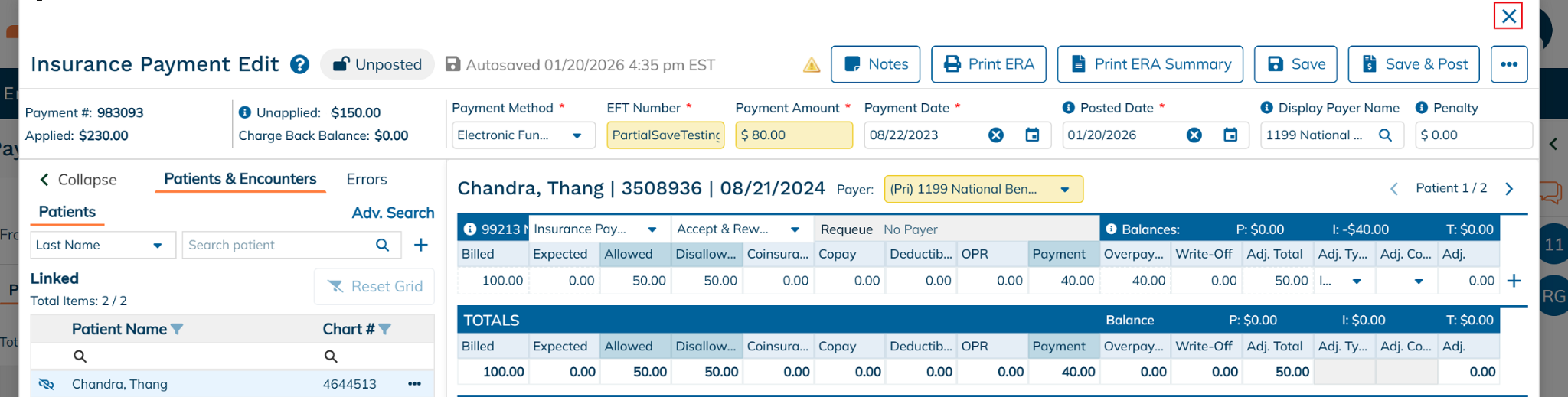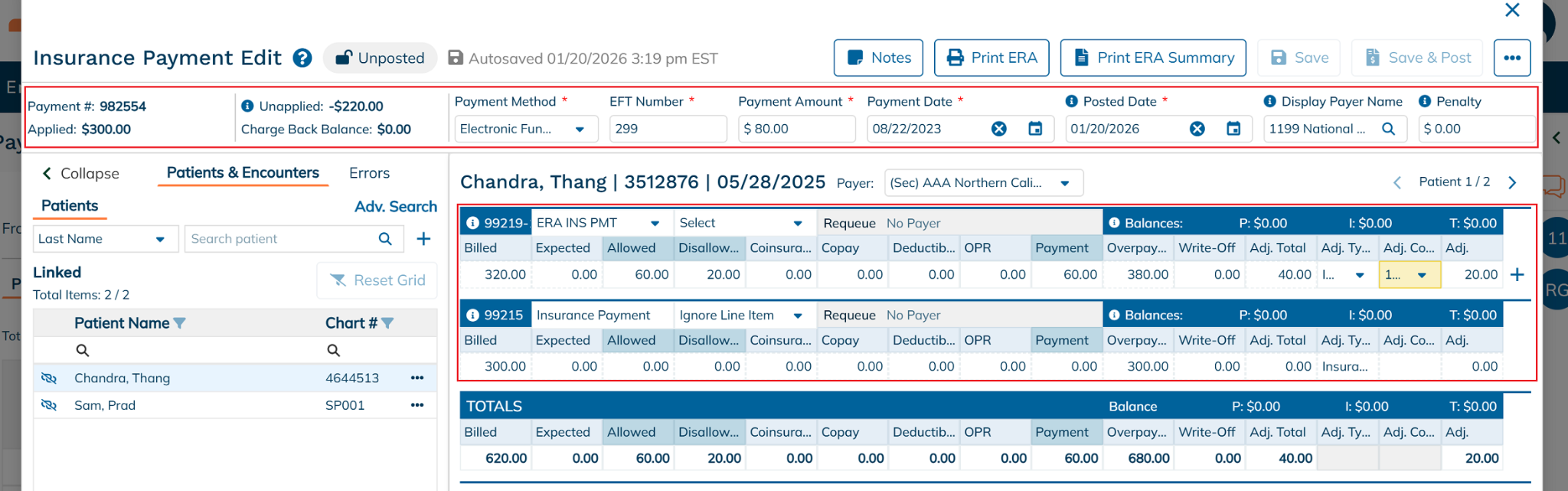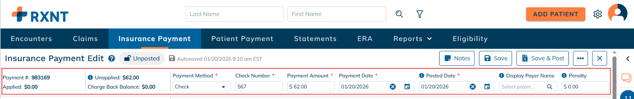 The insurance payment pop-up opens with all details automatically populated from the ERA. The payment details are located at the top of the screen. Below the payment details, you will see the encounter and line item details section.