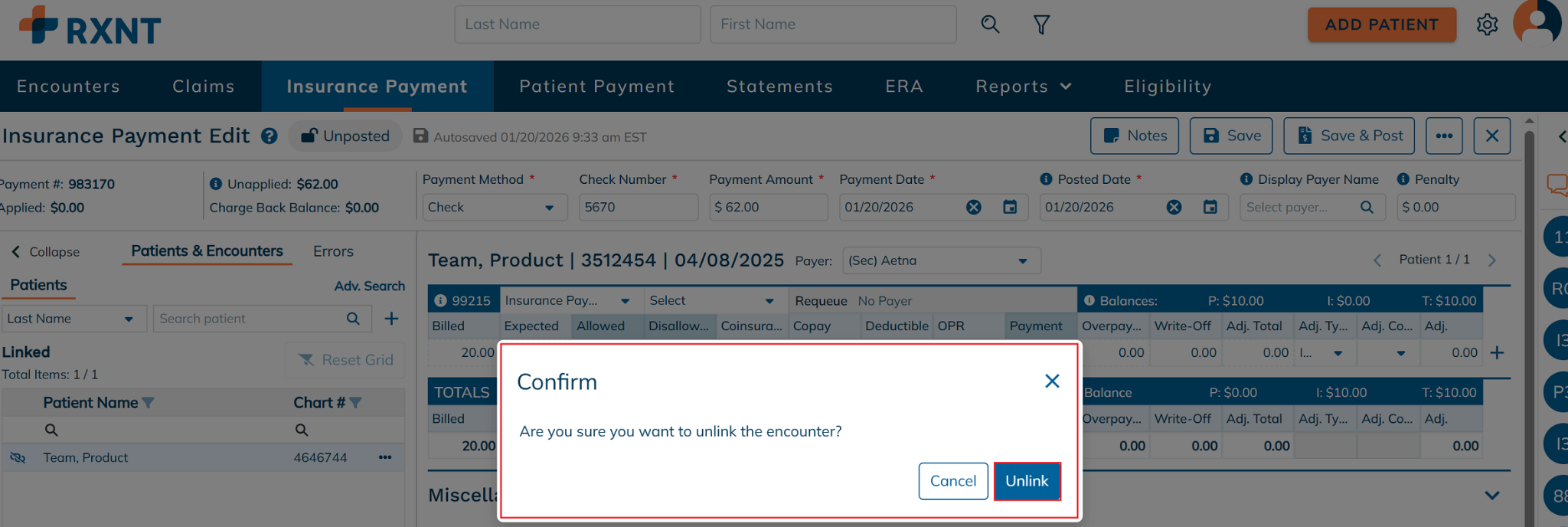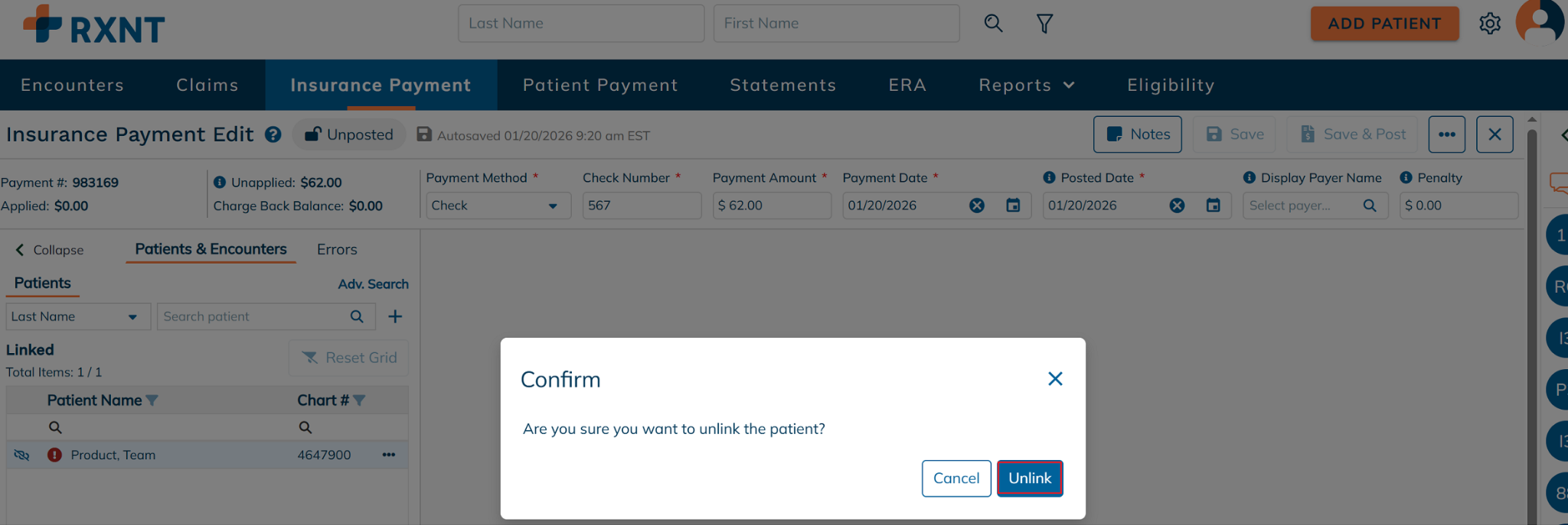 When you click the Link Chain icon under the Linked tab, you can unlink encounters and move them back to the Unlinked tab. This allows you to correct mistakes and reassign payments if needed.