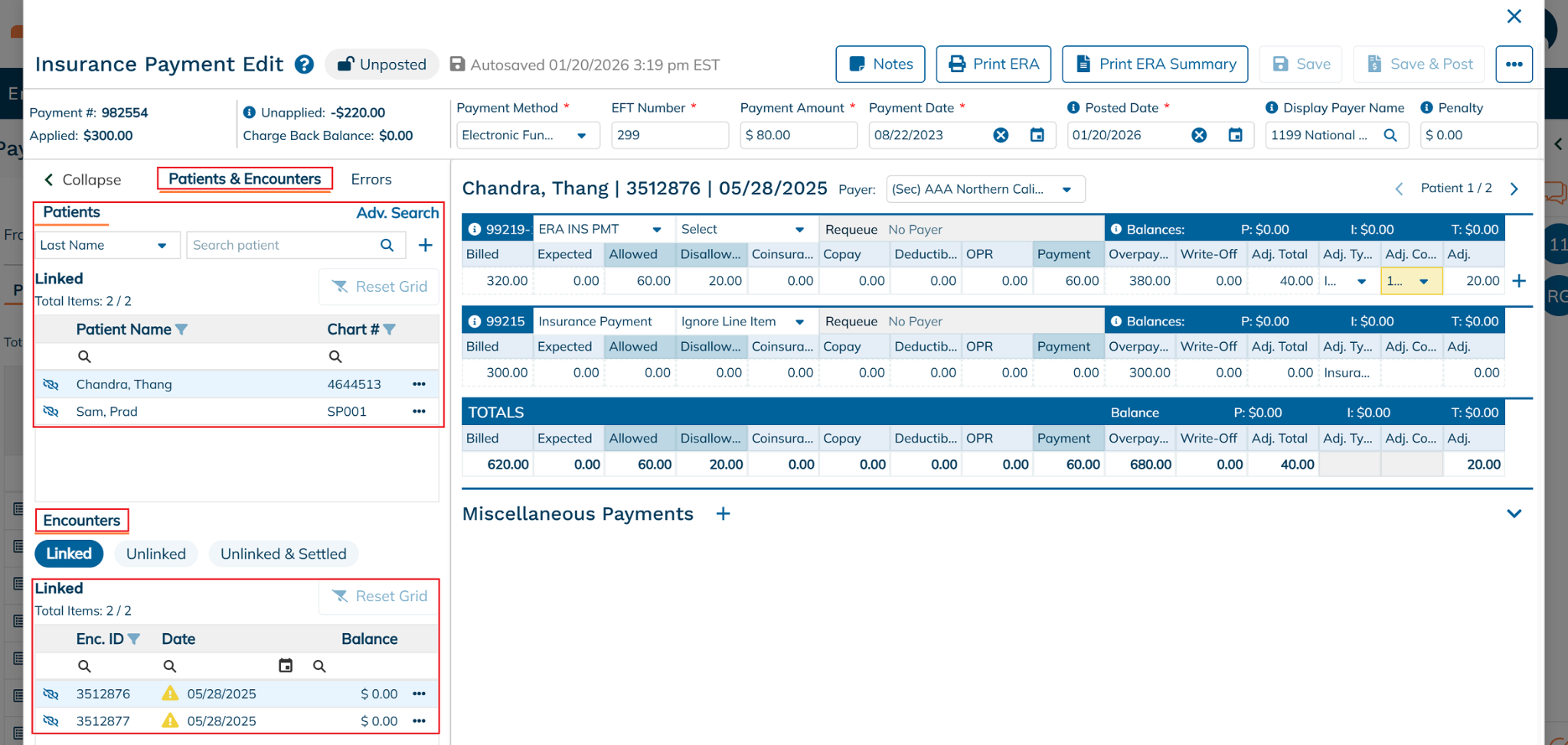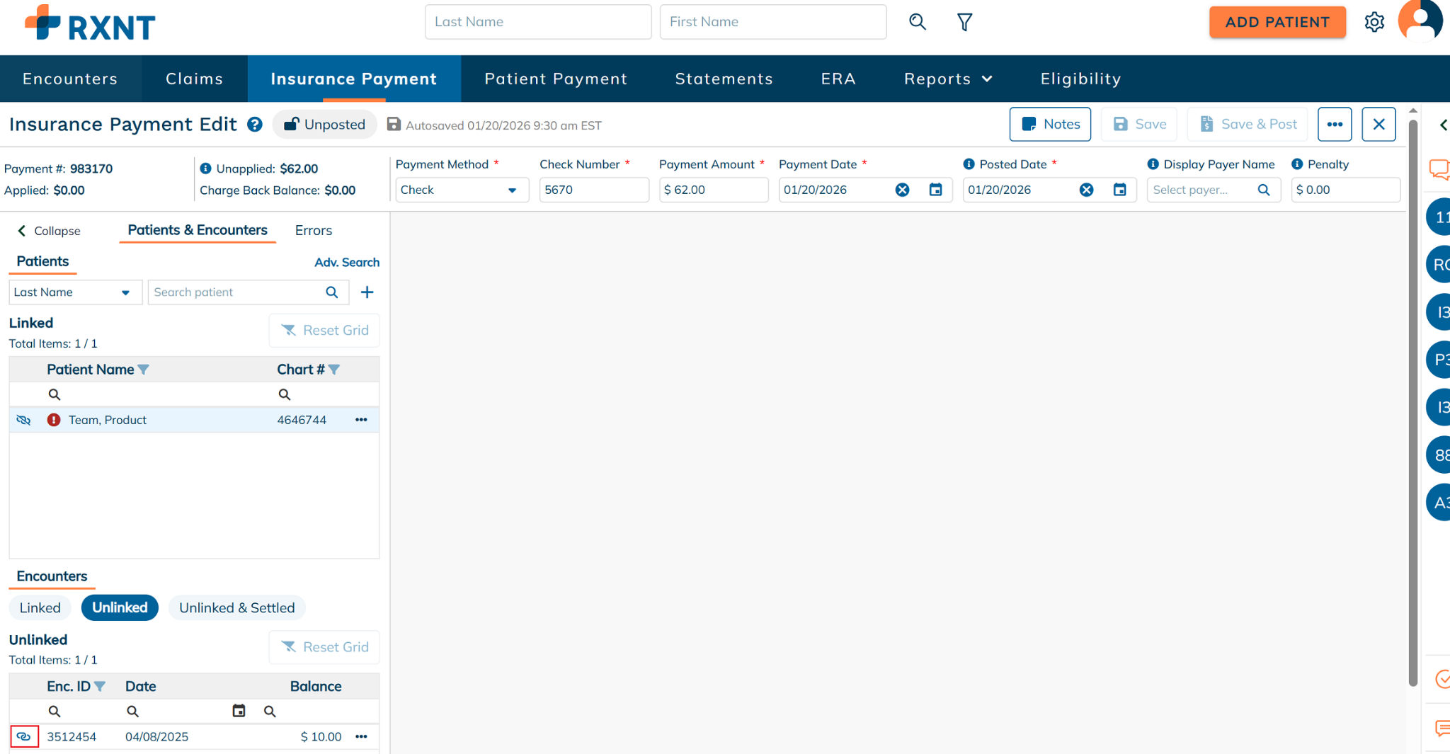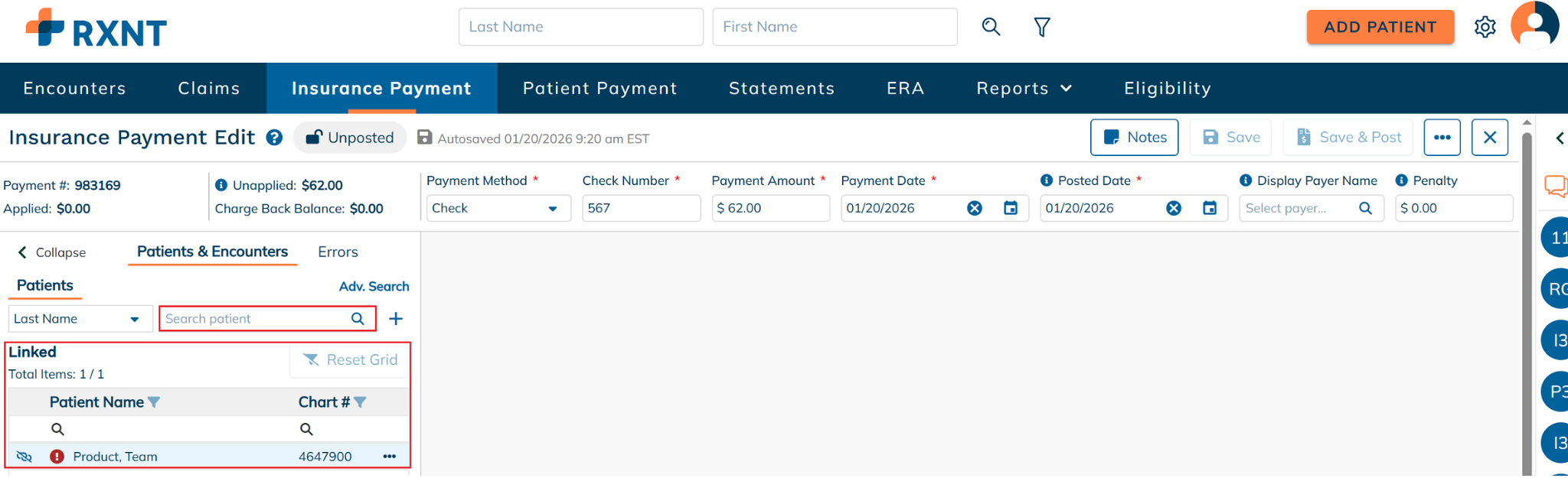 Once you’ve linked your patients, you must also link the corresponding encounter before applying the payment. Linking the encounter ensures that the payment is applied to the correct services or procedures on the patient’s account.