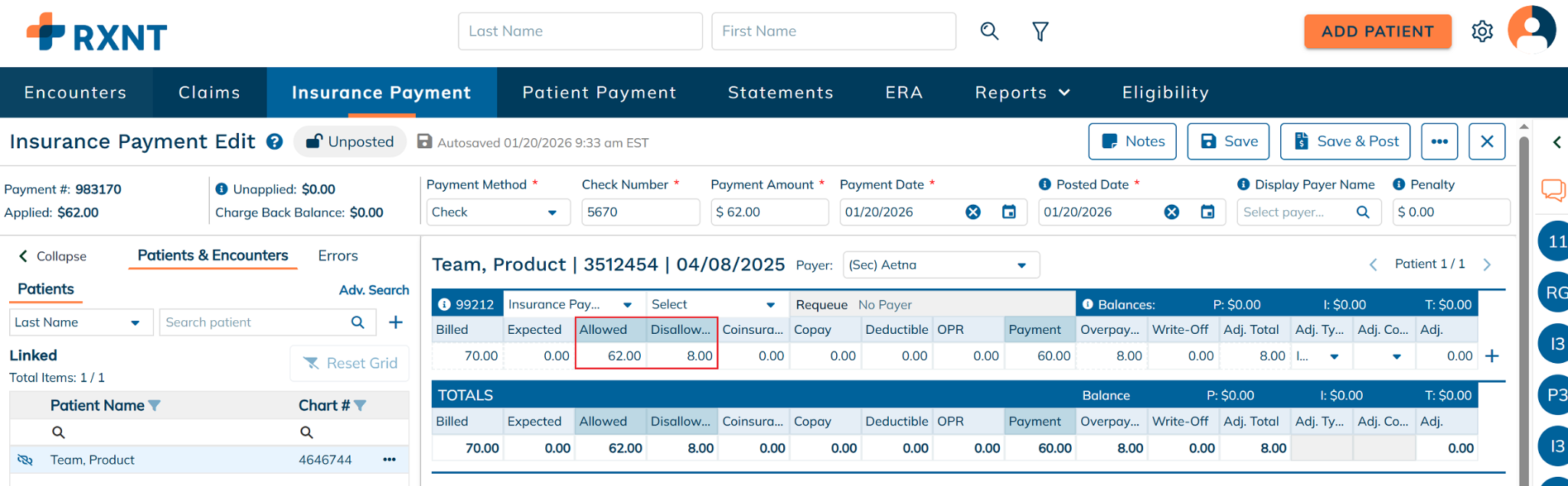 Enter the Allowed amount. Once you’ve entered the Allowed amount, the Disallowed amount will auto-populate for payers. However, both these fields can be edited.